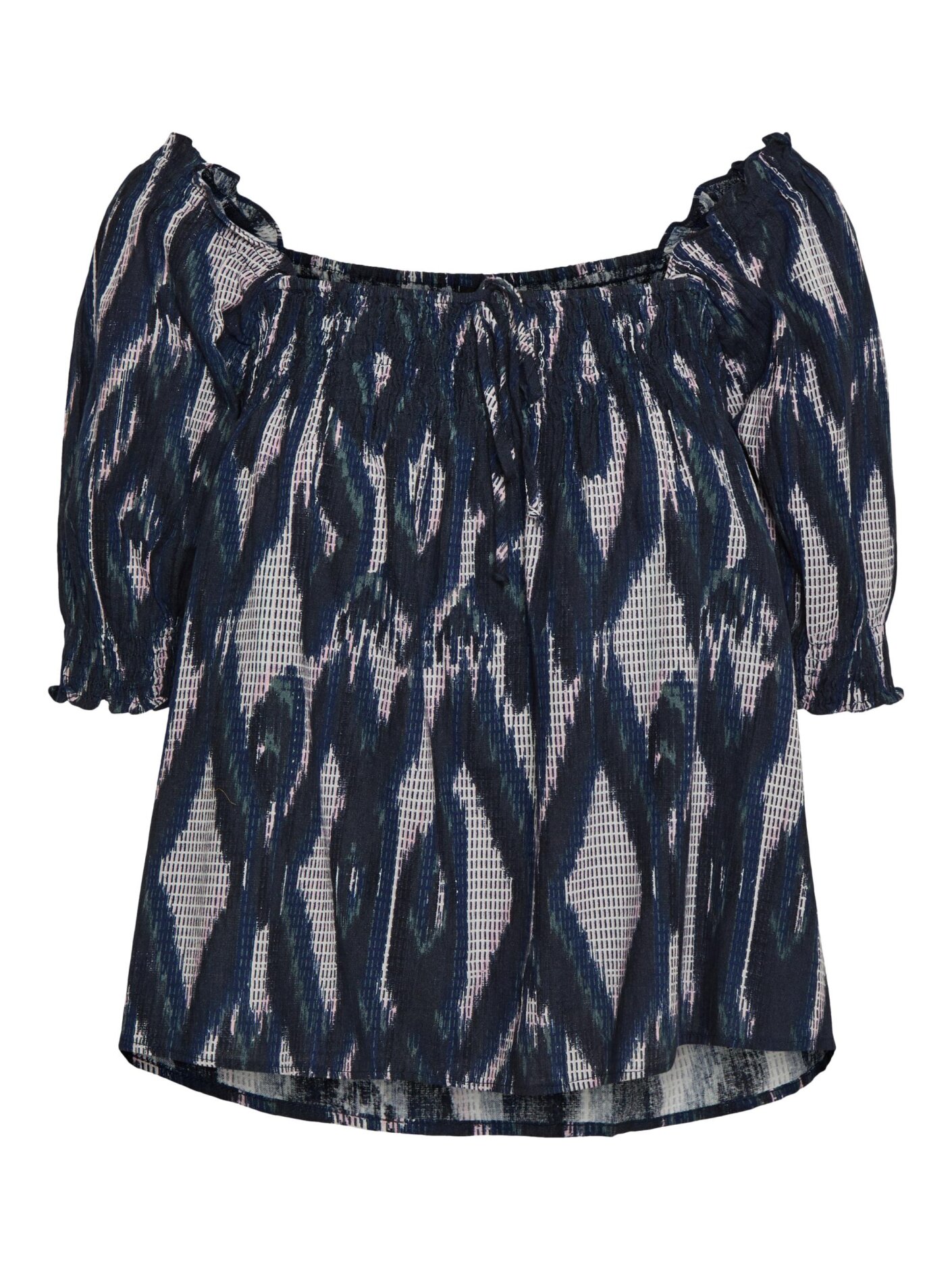 Fin top i 100% bommuld med mønstret motiv og med elastik i skuldrene.