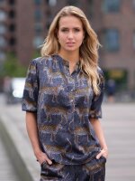 Bluse i et smukt satin dyreprint med leoparder på. Blusen har en rund hals med små fine læg, stolpelukning med guldknapper og albuelange ærmer med en lille smockafslutning.