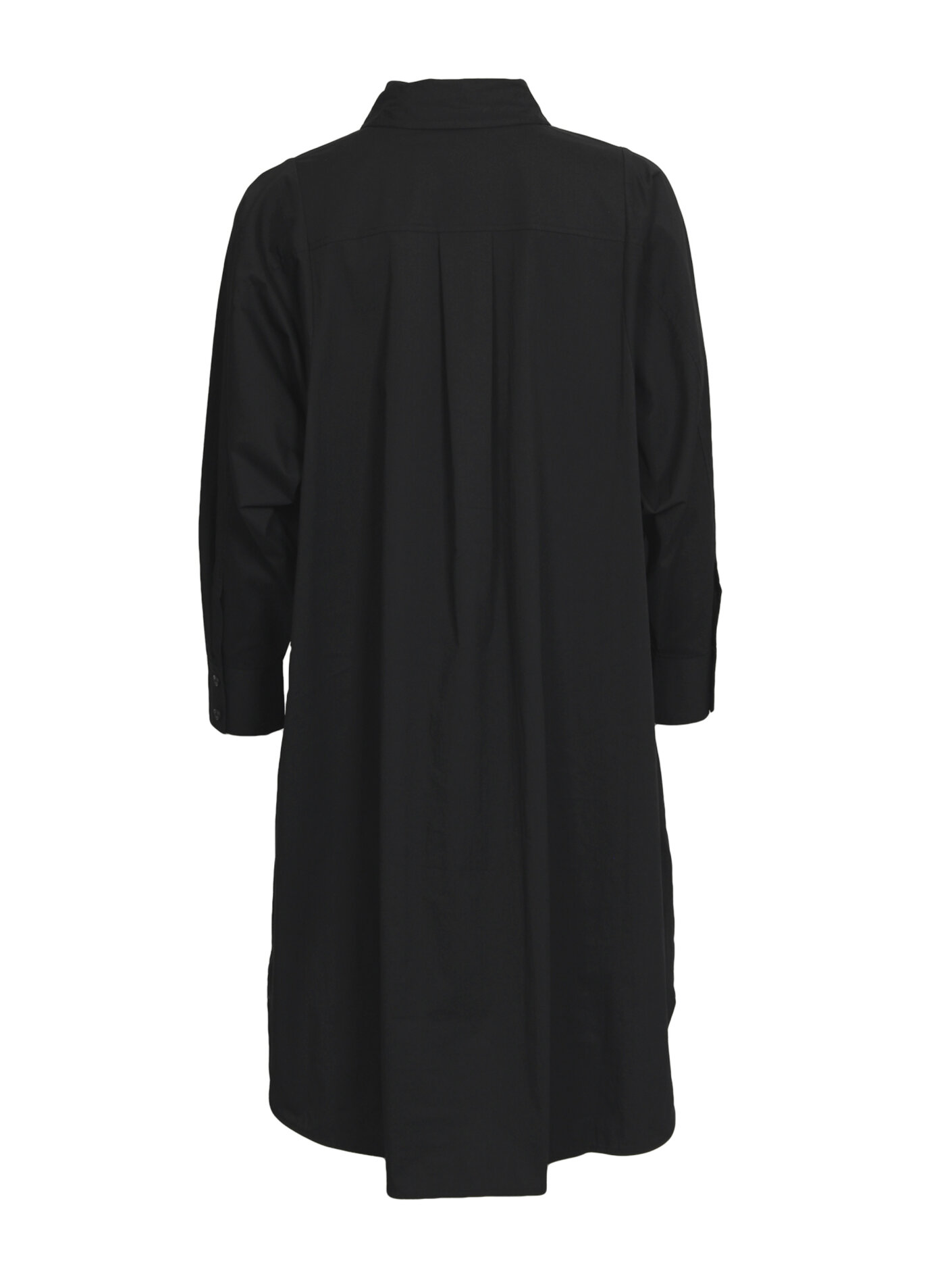 Skjortekjolen har lange brede ærmer med krave og knaplukning til under brystet. Pasformen er afslappet i et oversize look med slids i begge sider.