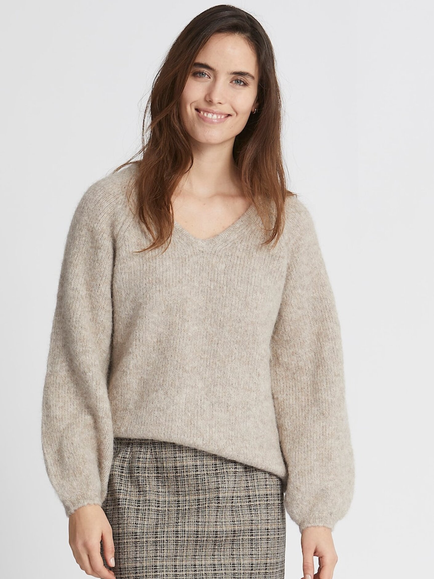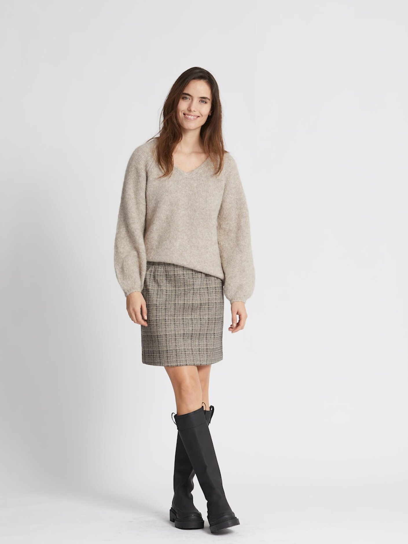 Vala strik fra RUE de FEMME, en tidløs og essentiel strik til din garderobe. Denne strik har en klassisk V-udskæring, hvilket giver en behagelig og stilfuld pasform. Med en normal pasform og en længde, der falder over hoften, er den perfekt til lagdeling. Den rolige hvide sandfarve tilføjer et strejf af elegance.