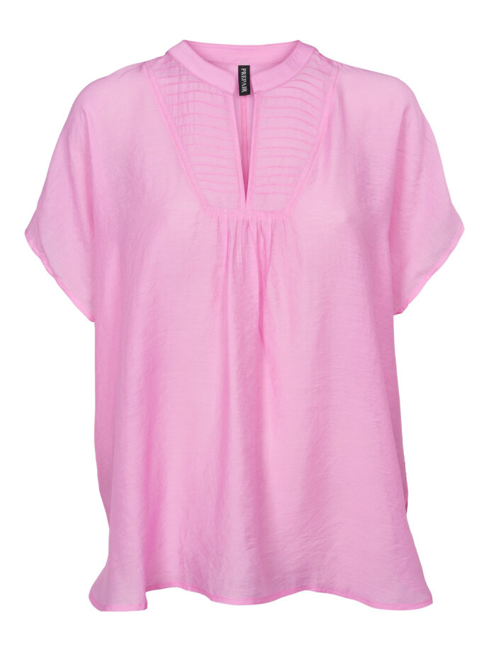 Vilde blusen fra PREPAIR med de fineste detaljer. Blusen har korte flagermusærmer og v-hals med små vandrette læg foran. Den er transparent og kan med fordel bruges med en top under.