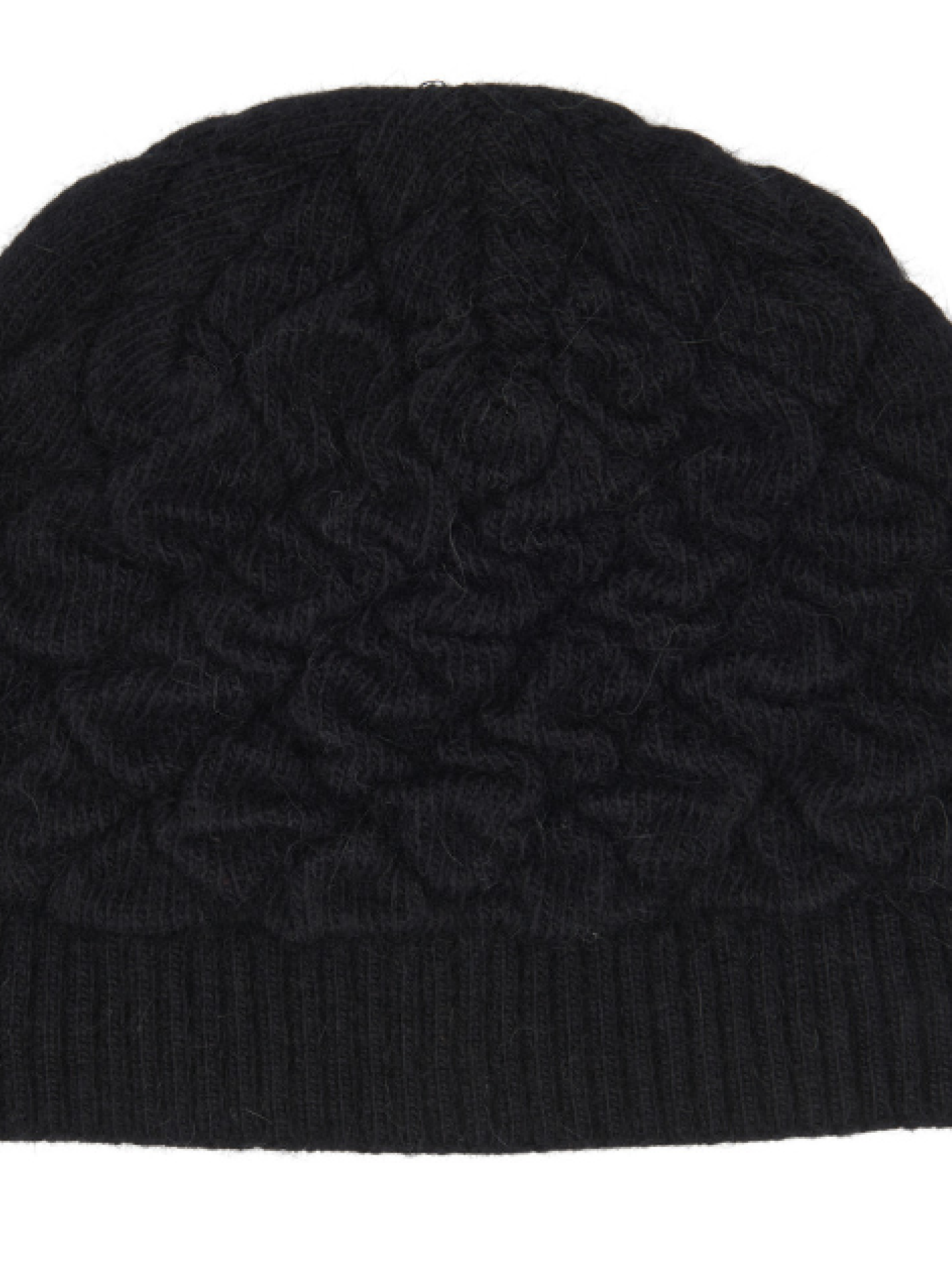 Denne strikkede hue har et fint boblemønster, som giver et blødt og roligt udtryk. Huen sidder behageligt på hovedet og afsluttes forneden med en ribkant, der sikrer god komfort og holder formen pænt i brug.Materialeblandingen med blandt andet angora gør huen let, lun og rar at have på. Den egner sig godt til hverdagsbrug i den kølige sæson og kan nemt kombineres med både jakke og frakke.