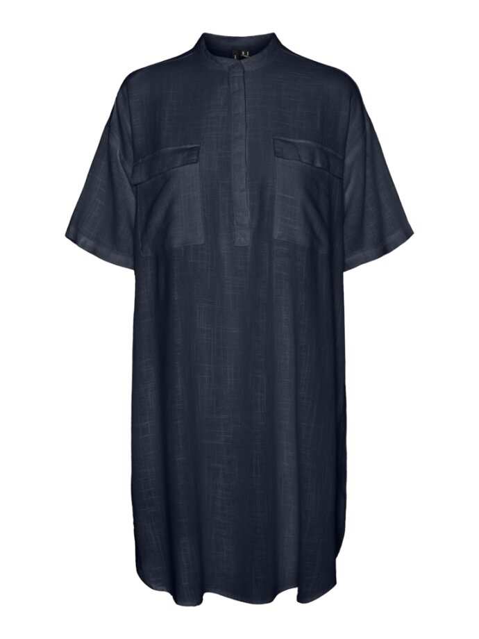 VMLINE 2/4 Linen Mix Tunic er den perfekte midikjole til denmoderne kvinde, der ønsker en alsidig og stilfuld garderobe. Med sin lette ogluftige blanding af 80 % viskose og 20 % hør, tilbyder denne tunika bådekomfort og elegance. Kjolens V-hals og 2/4 ærmer gør den ideel til både varmeforårs- og sommerdage samt de køligere aftener. Den knælange længde og detklassiske navy blazer-design gør den til et alsidigt valg, der kan styles tilbåde hverdag og fest.