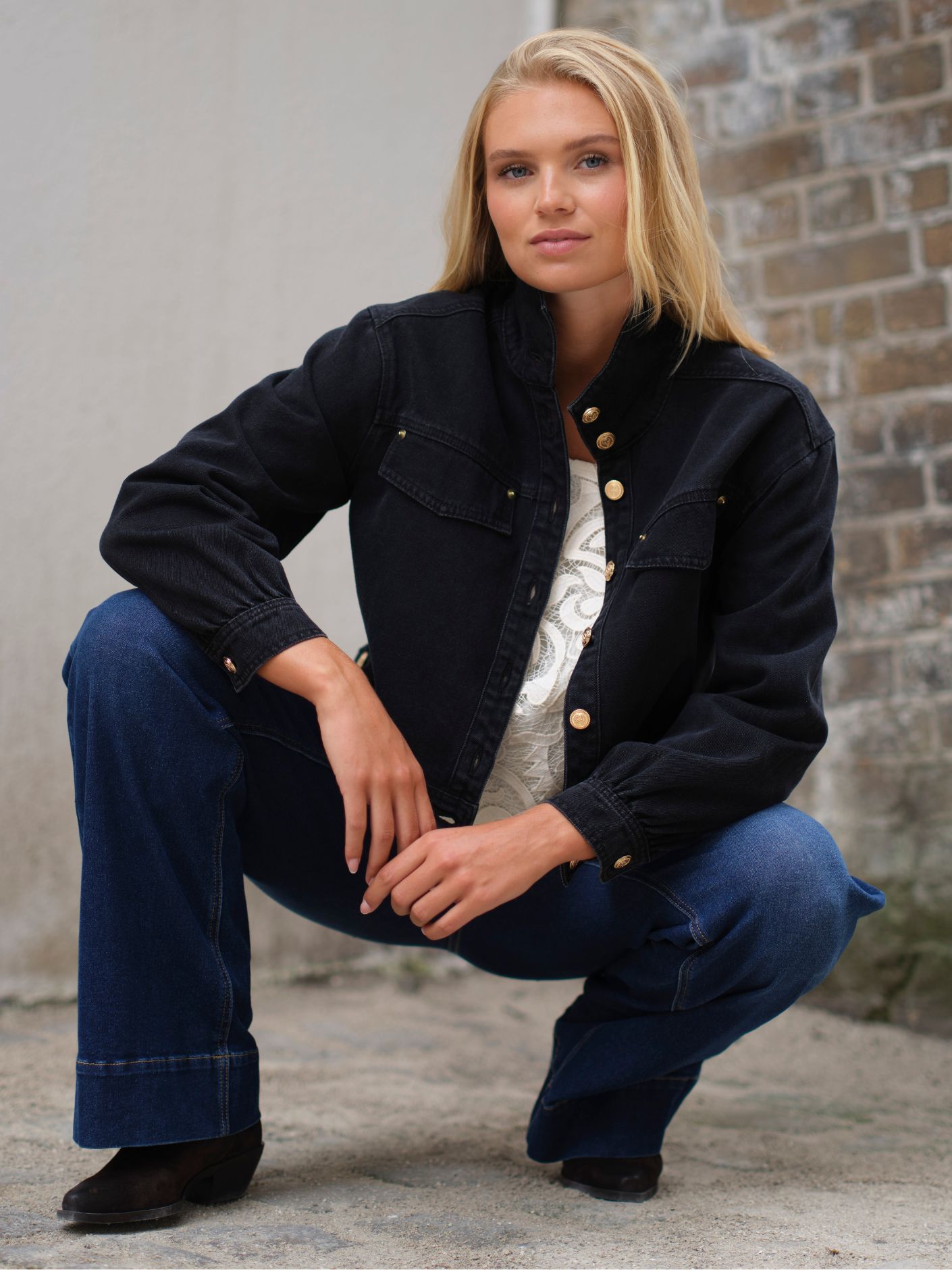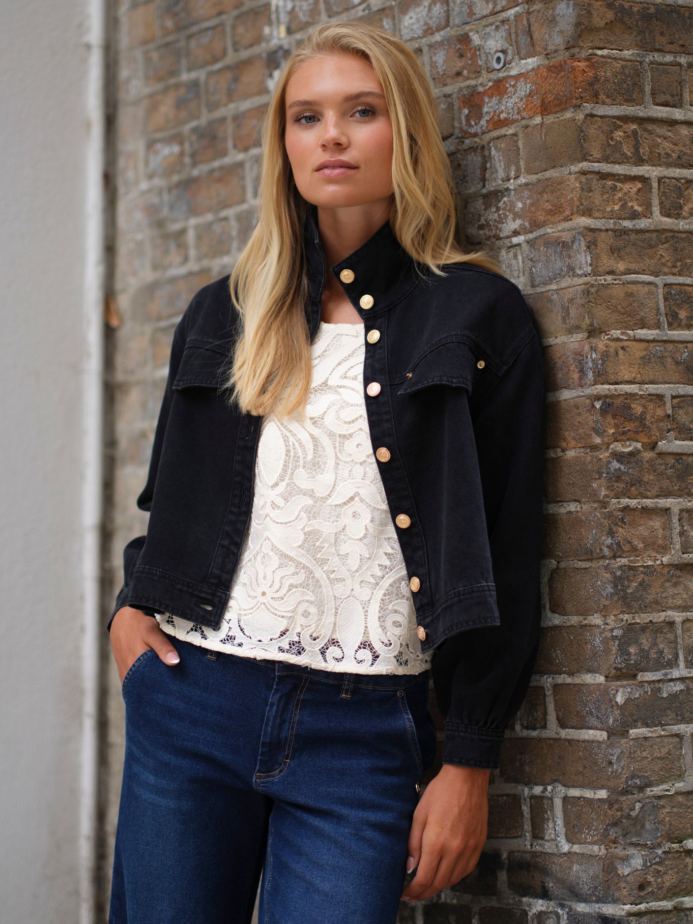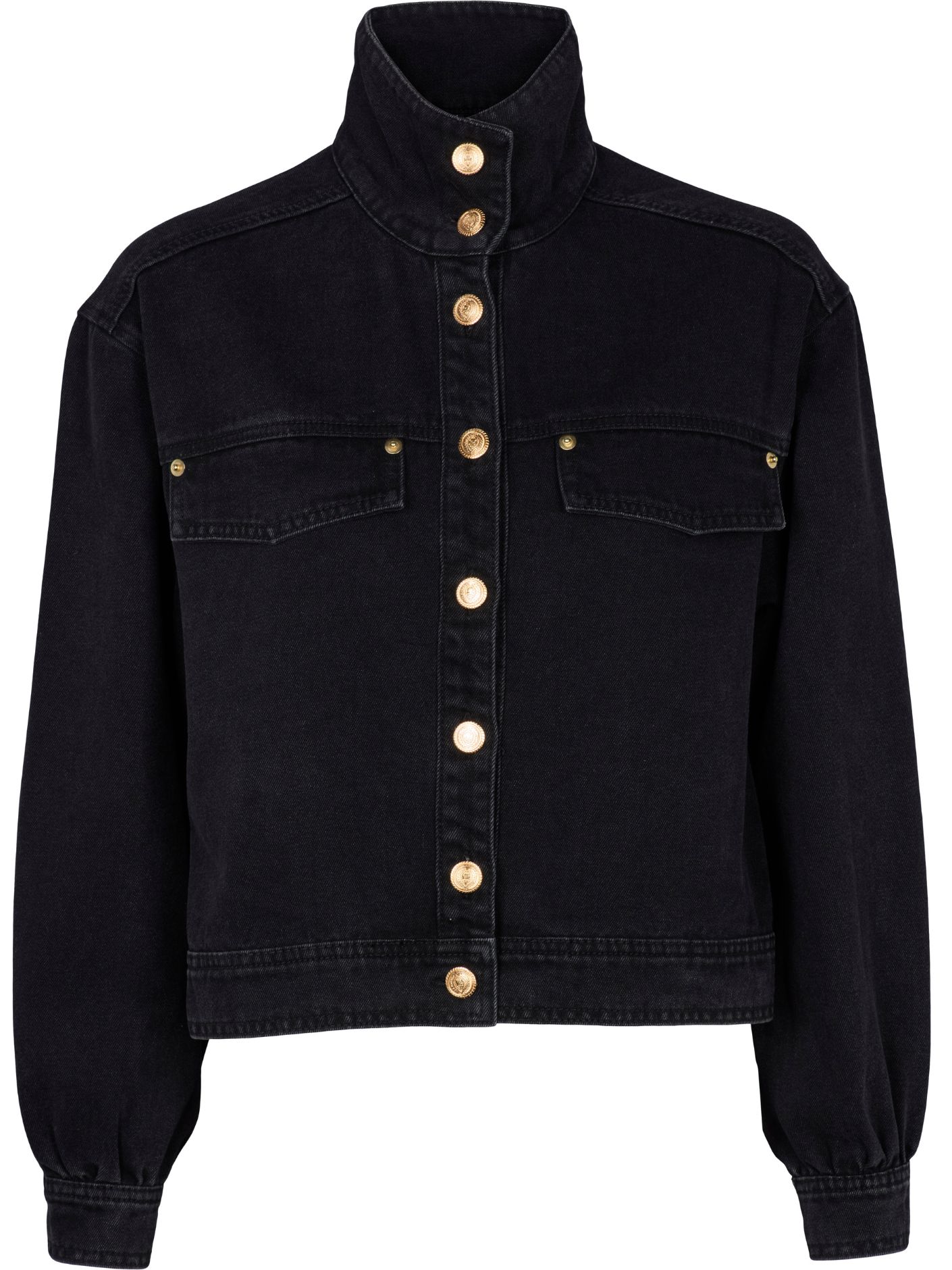 Frederikke Jacket fra Prepair er en moderne, kort denimjakke i et let oversized design med markante gyldne knapper og store pyntebrystlommer.