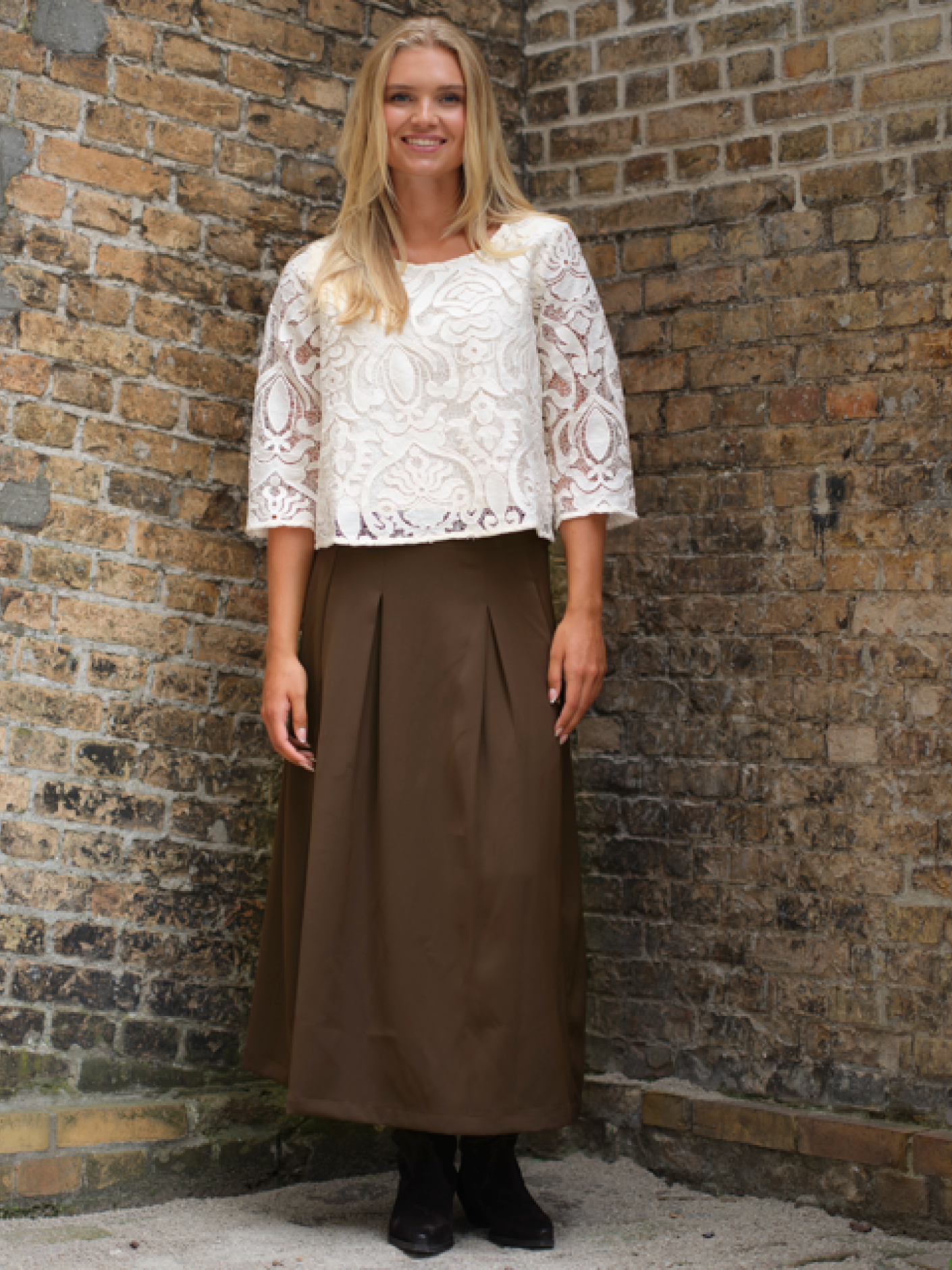 Prepair nederdel er en elegant og velsiddende lang nederdel med et roligt og feminint udtryk. De faste læg foran giver et flot fald og skaber bevægelse i stoffet, som klæder både en enkel bluse og mere detaljerede overdele.Nederdelen lukkes diskret med lynlås bagpå og har en glat talje, der sidder pænt uden at virke stram. Et alsidigt valg til både hverdag og pænere brug, hvor komfort og et tidløst look går hånd i hånd.