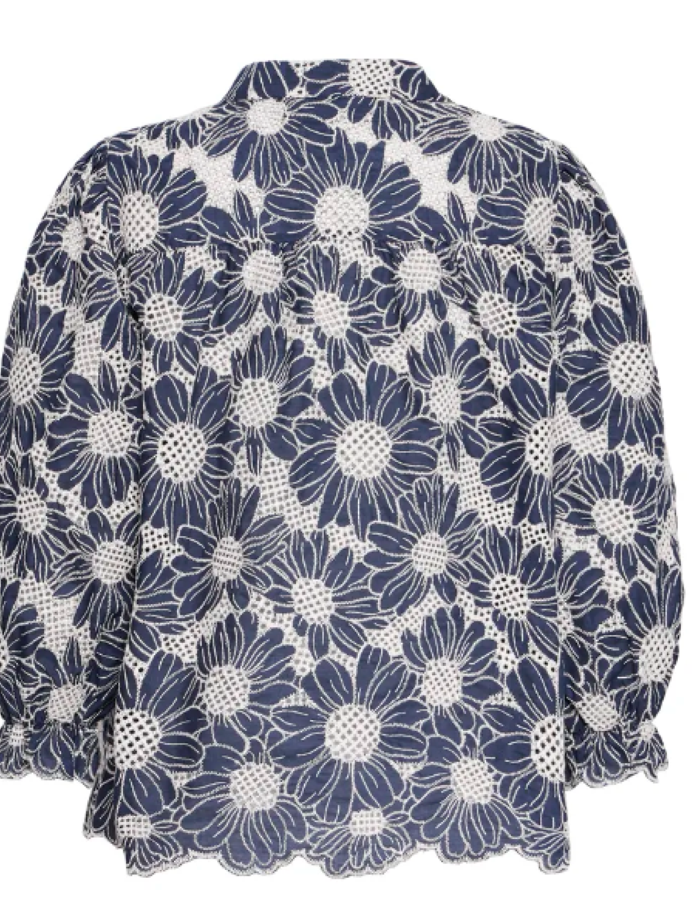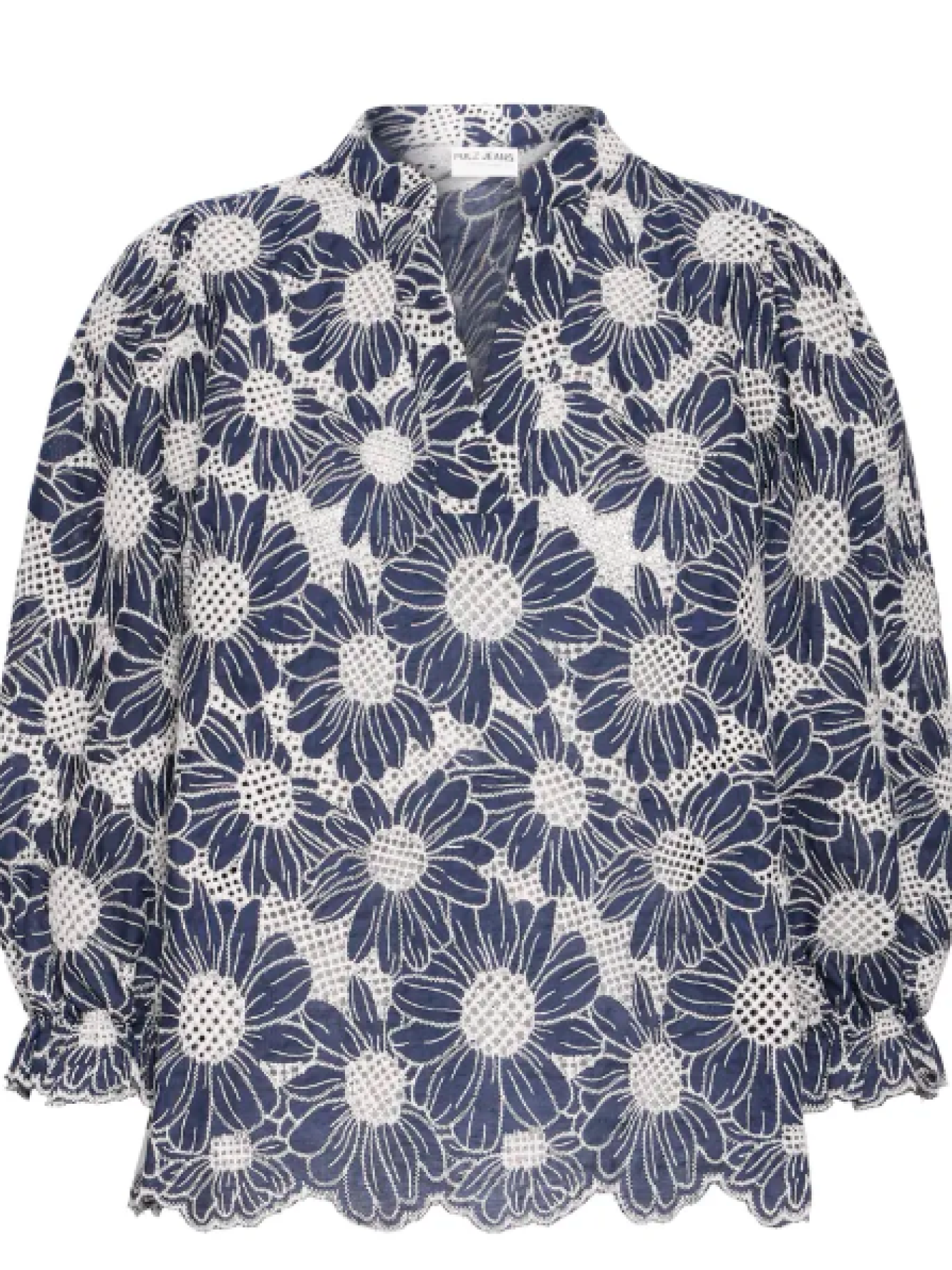 Pulz Jeans bluse i let bomuld med et broderiinspireret blomsterprint i navy og hvid, der giver et roligt og feminint udtryk. Den fine V-udskæring og de trekvartlange ærmer med blid volumen skaber en let og afrundet silhuet, mens den bølgede kantafslutning tilfører et diskret, elegant præg.Det rene bomuldsmateriale har en let struktur og føles behageligt mod huden, hvilket gør blusen velegnet til både hverdag og mere klassiske kombinationer. Den rummelige pasform gør den nem at style med både jeans og nederdele, særligt på dage med skiftende temperaturer.