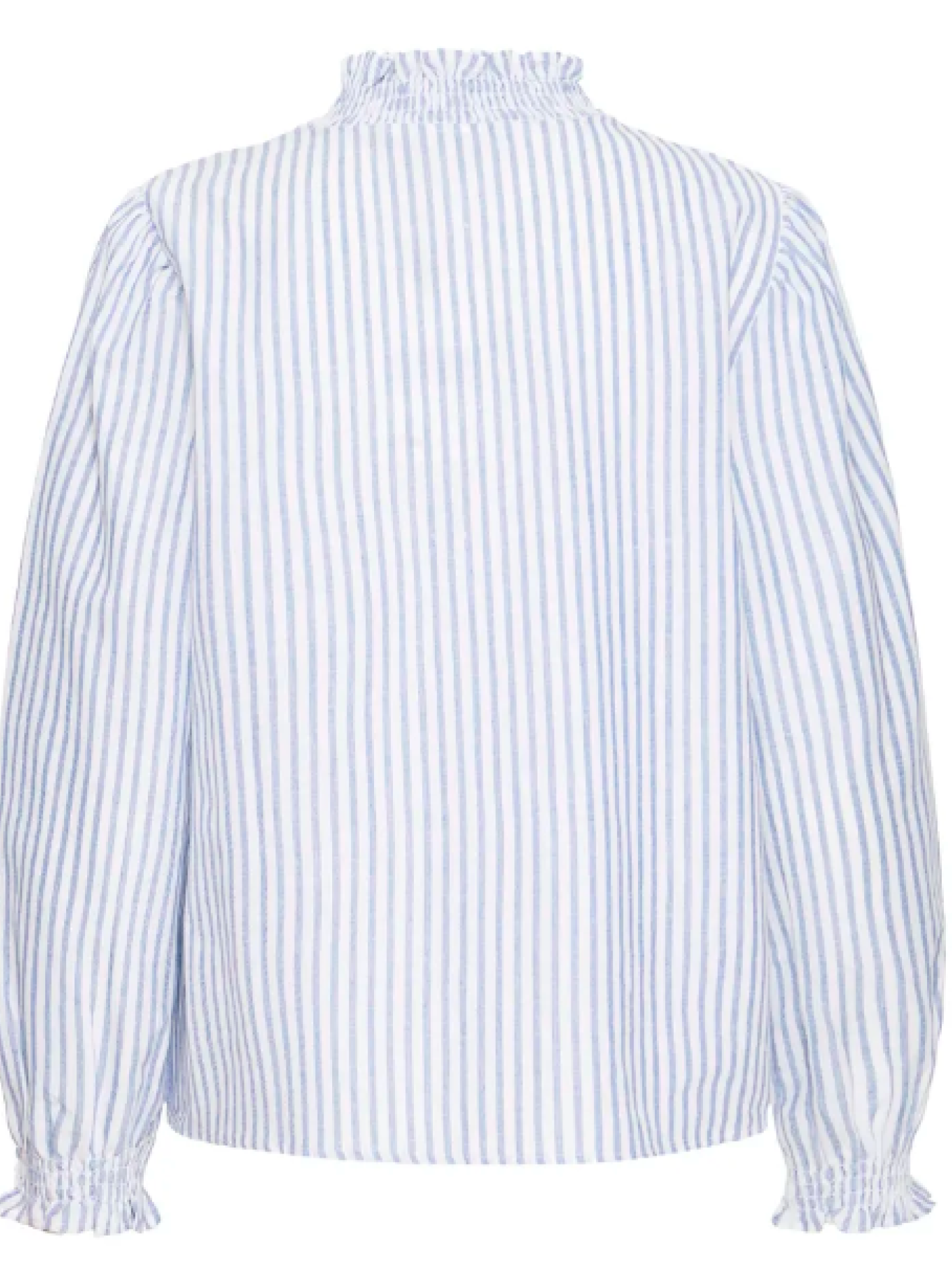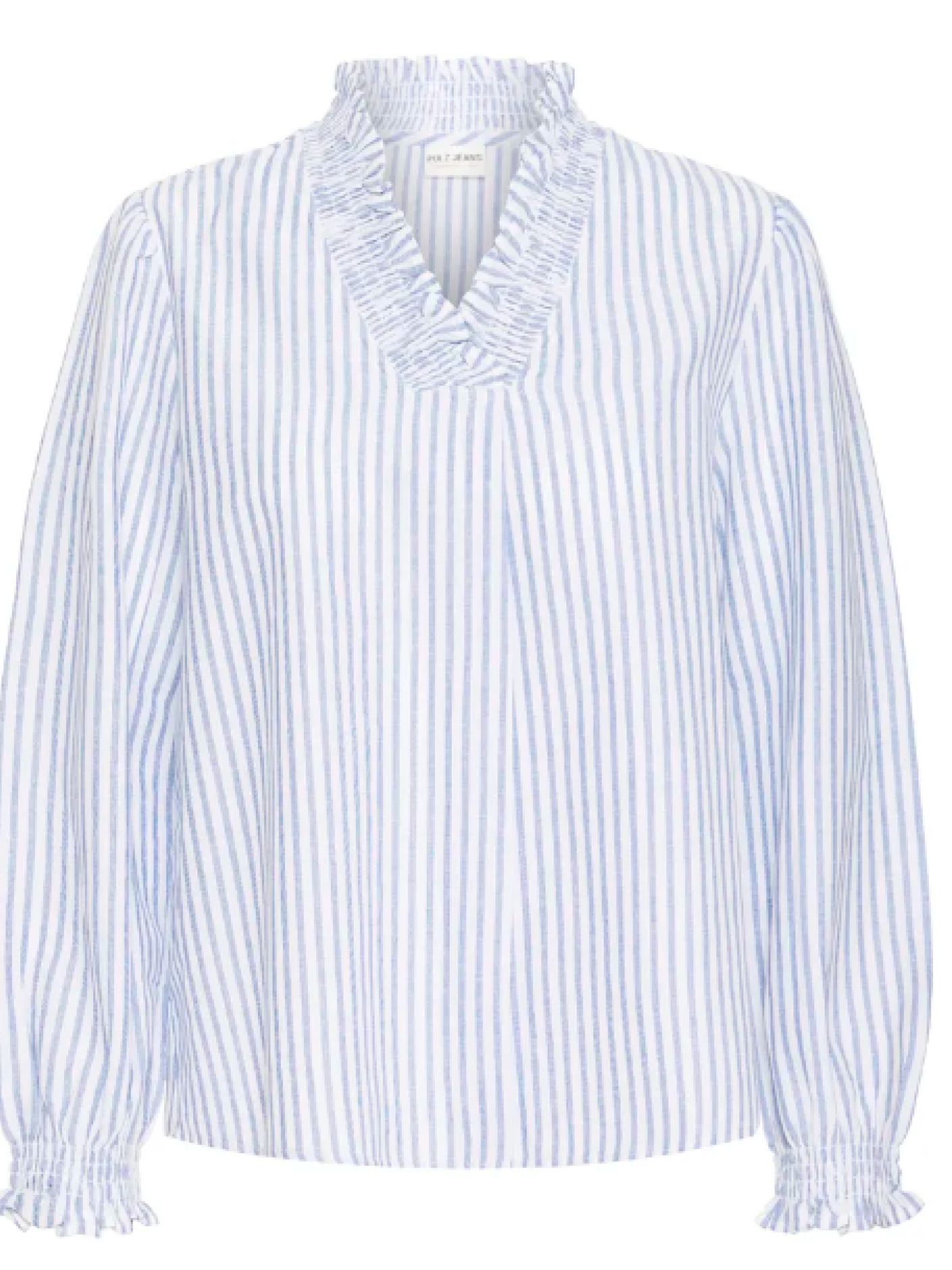 Pulz Jeans bluse i let bomuld med fine blå striber, der giver et rent og frisk udtryk. V-udskæringen er afsluttet med små rynker, som tilfører et feminint præg, mens de lange ærmer med elastik ved håndleddet skaber en blød og afrundet silhuet. En behagelig style, der fungerer naturligt i både hverdag og arbejdstid.Det rene bomuldsmateriale gør blusen åndbar og komfortabel hele dagen. Den let rummelige pasform giver god bevægelse og gør den nem at kombinere med både jeans og nederdele, når du ønsker et klassisk, let og ubesværet udtryk.