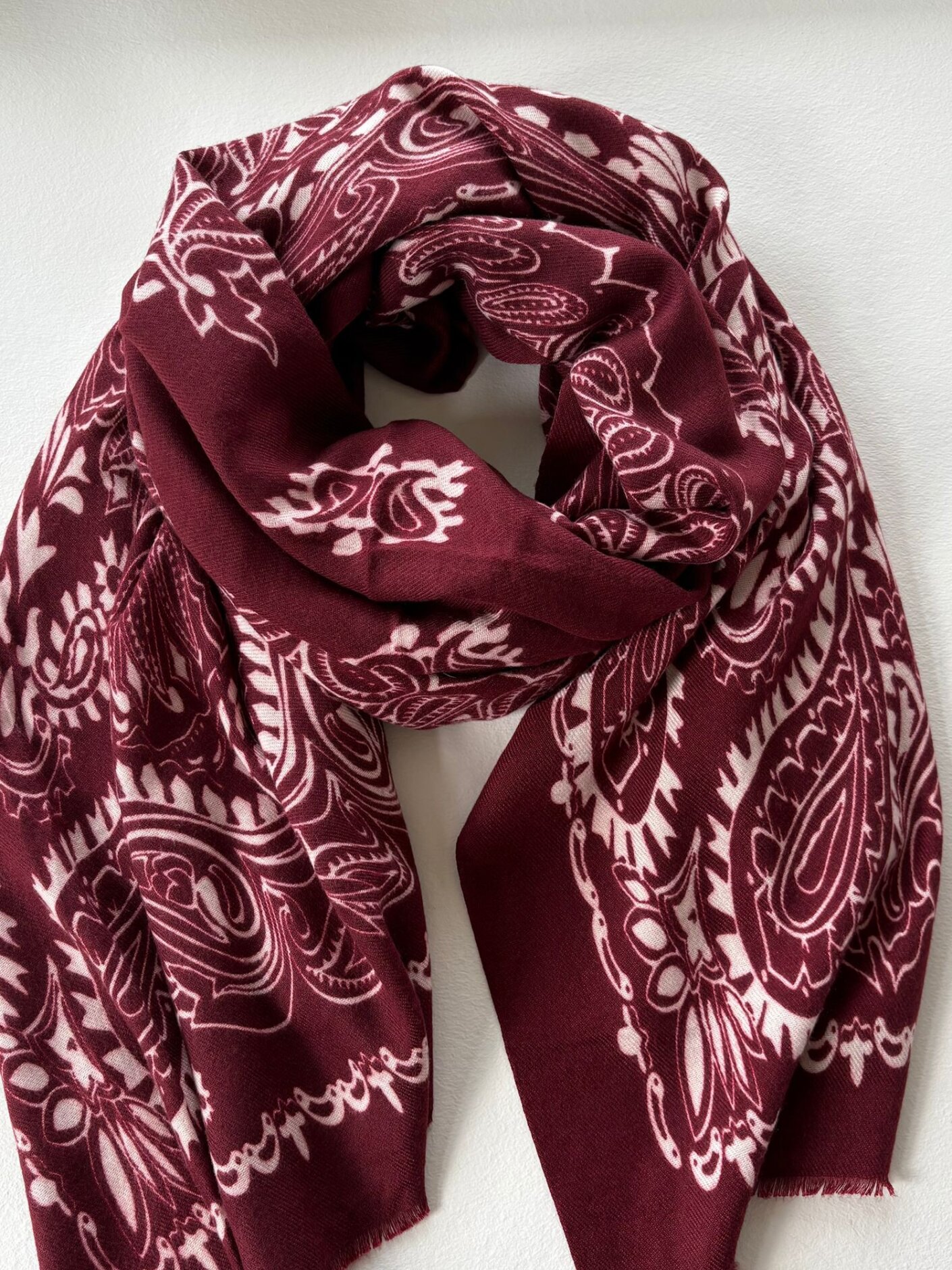 Tilføj et elegant og varmt touch til din garderobe med dette smukke bordeauxfarvede tørklæde. Det klassiske paisleymønster giver et sofistikeret udtryk, mens den bløde kvalitet sikrer en behagelig følelse mod huden.