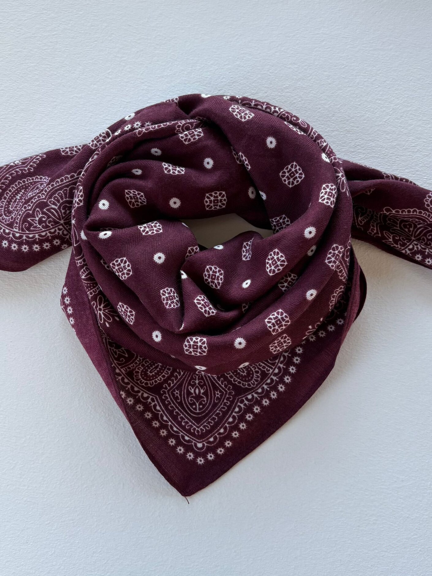 Tilføj et stilfuldt og farverigt touch til dit outfit med dette smukke tørklæde fra Three M. Det kommer i en dyb bordeaux nuance, som giver et varmt og eksklusivt udtryk, og er dekoreret med et klassisk paisley-mønster kombineret med små grafiske detaljer. Et perfekt accessorie til både hverdagsbrug og mere elegante looks.