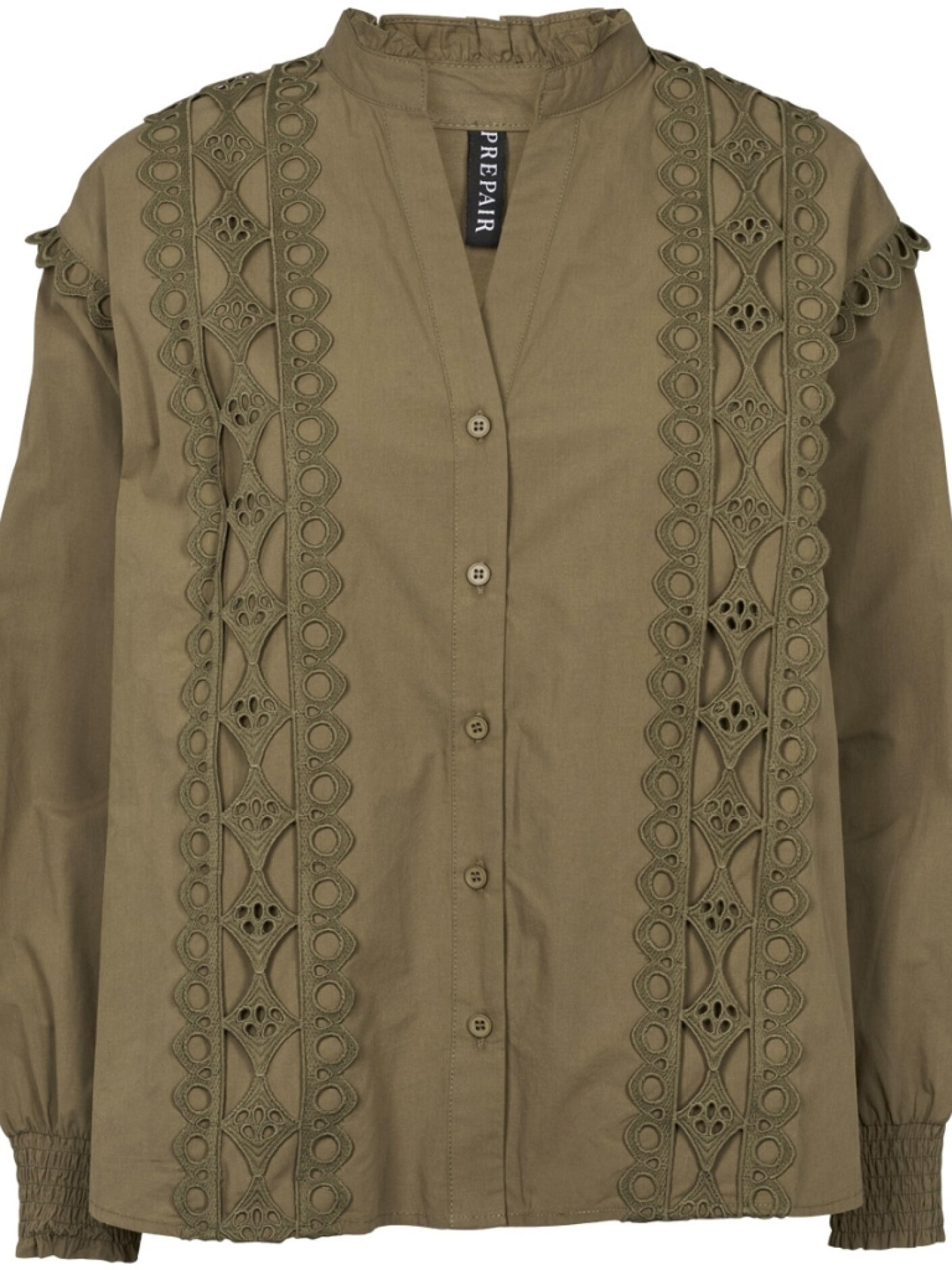 Prepair Monique Blouse er en feminin og velafbalanceret bluse med fine detaljer, der giver et roligt og elegant udtryk. Den lille flæsekant i halsen kombineret med V-udskæring og gennemgående knapper skaber et let og klædeligt look, som fungerer både til hverdag og mere pæne anledninger.De brede broderede bånd langs fronten og over skuldrene tilfører karakter, uden at blusen bliver tung i udtrykket. Ærmerne afsluttes med elastik, som giver en blød silhuet og gør den behagelig at have på dagen igennem. En stil, der er nem at sætte sammen med både jeans og nederdele.