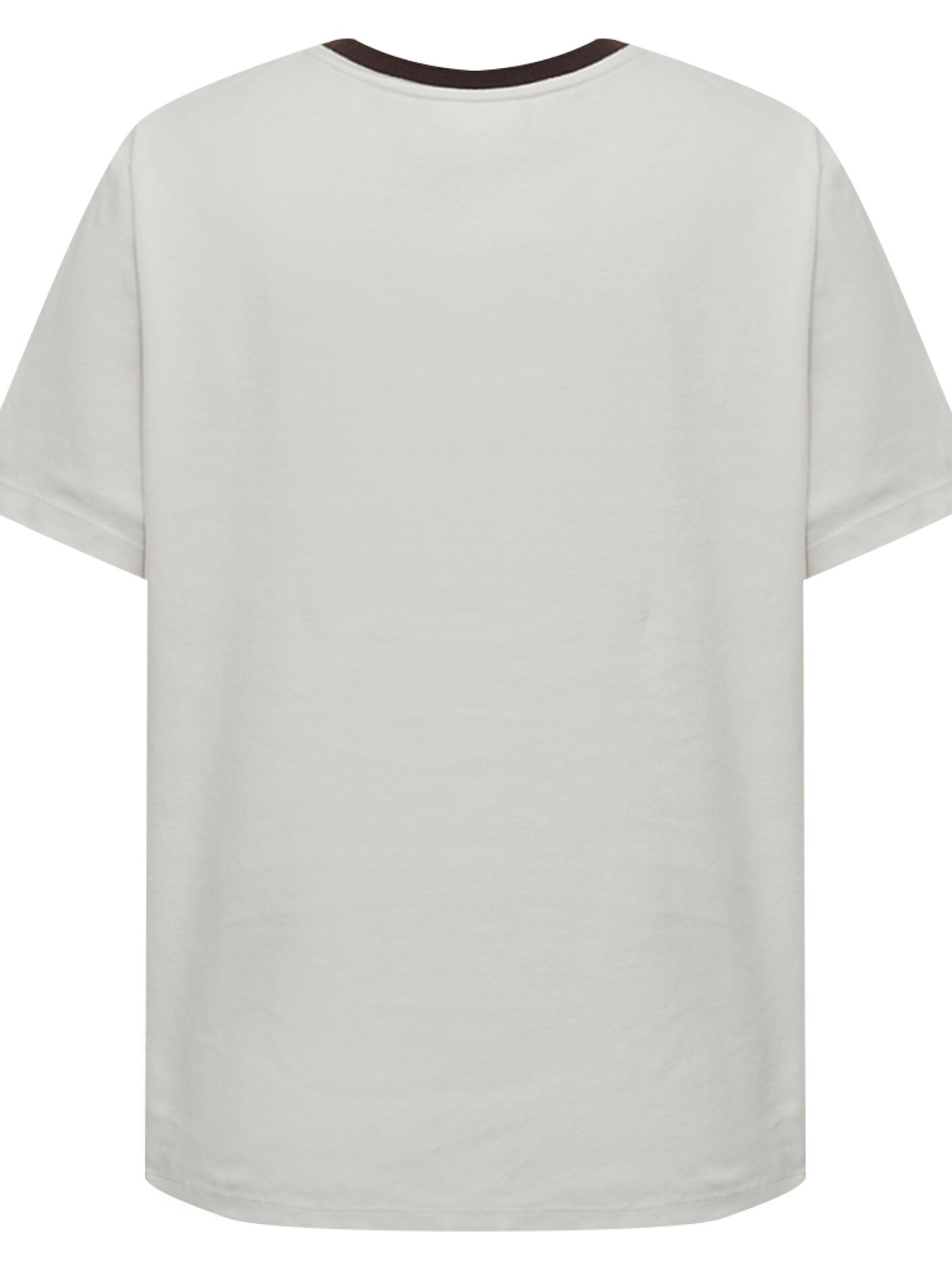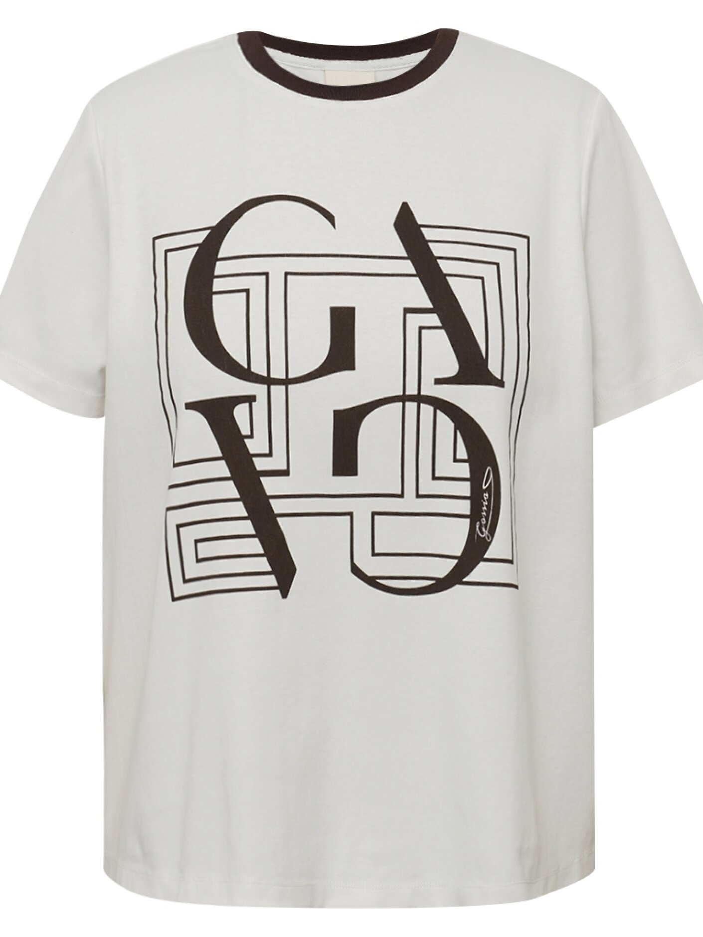 Denne T-shirt i blød bomuld har et markant grafisk frontprint, som giver et moderne og stilrent udtryk. Farven fra printet går igen i halsribben og skaber en gennemført detalje, der løfter det enkle design.Kvaliteten er let og behagelig med en smule stretch, så T-shirten holder formen flot vask efter vask. Den fungerer perfekt til hverdag med jeans og sneakers, men kan også styles under en blazer for et mere urbant look.