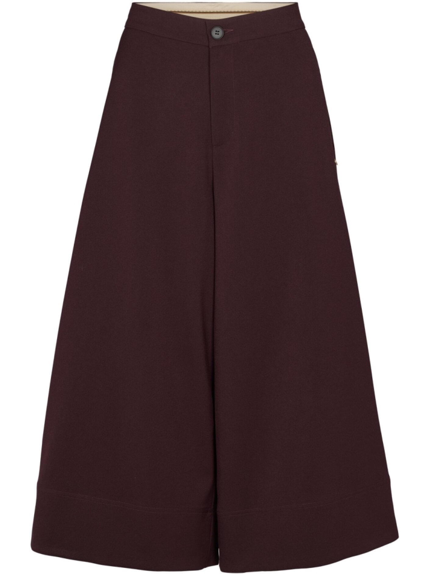 Høj talje med fast linning og brede ben i culotte-længde. Modellen er 175 cm og bruger str. S. Inseam ca. 57 cm i alle størrelser.