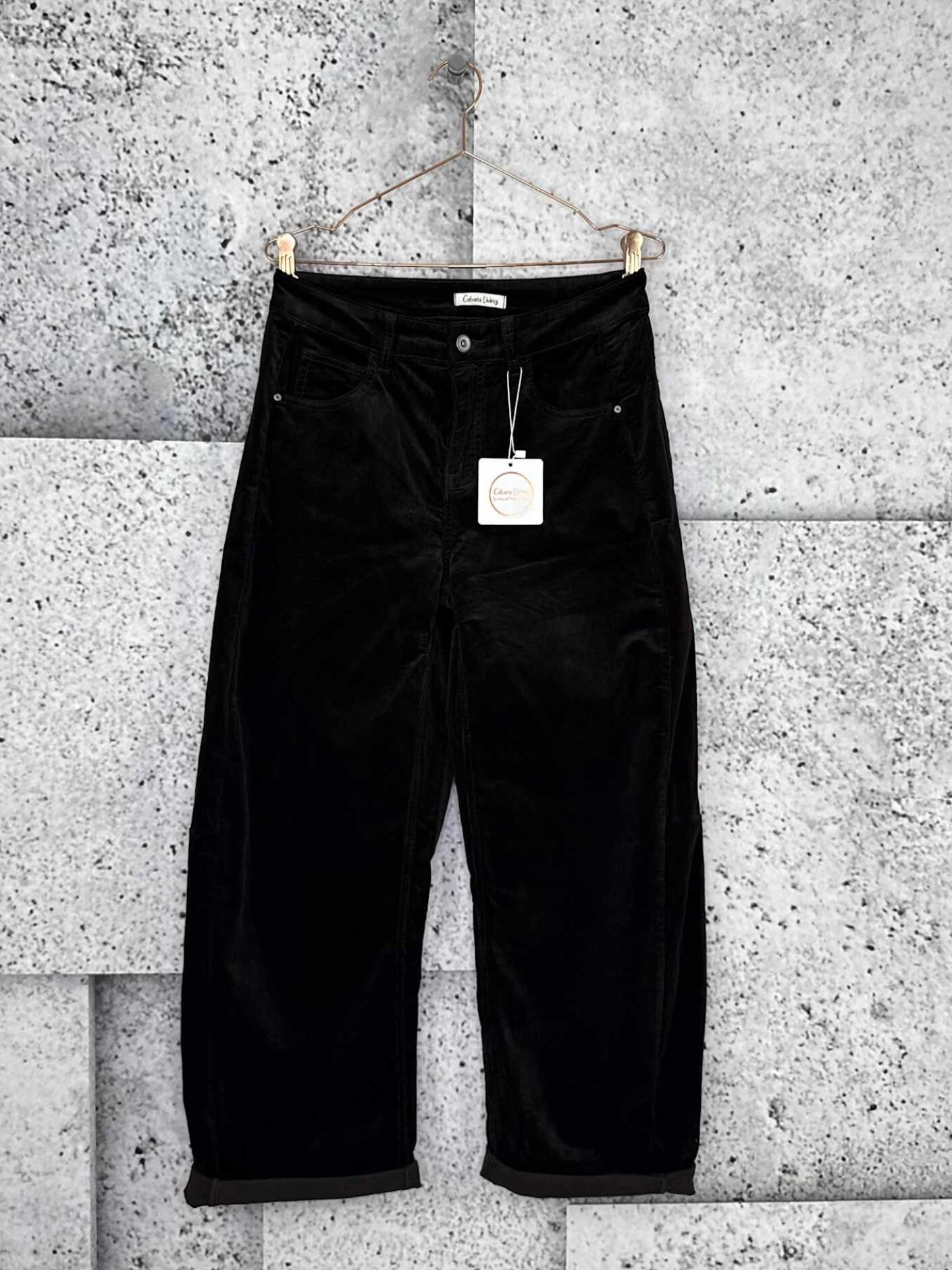 Cabana Living babyfløjlsbukser i sort er et roligt og anvendeligt valg til hverdagen. Den bløde babyfløjl giver en behagelig overflade og et afslappet udtryk, som fungerer godt både med strik, skjorter og en enkel t-shirt.Buksen har et klassisk femlommers design og en komfortabel linning med let stræk. Pasformen er rummelig uden at virke løs og giver god bevægelsesfrihed. Et par bukser, der er nemme at bruge sæson efter sæson.