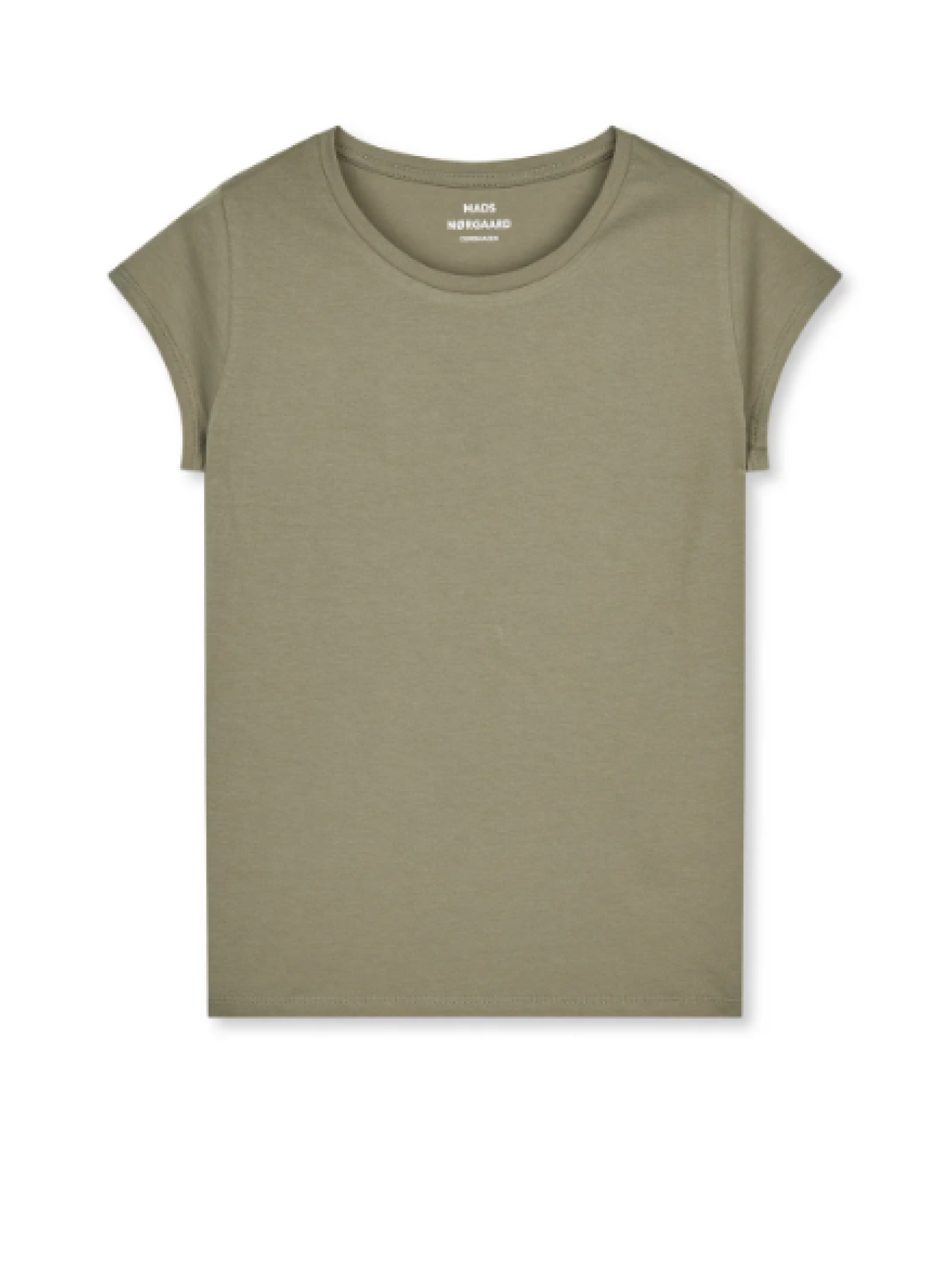 Mads Nørgaard Fine Jersey Teasy Tee FAV er en tætsiddende t-shirt i en let og blød kvalitet, der smyger sig behageligt til kroppen. Den afdæmpede grønne nuance giver et roligt og naturligt udtryk.De helt korte ærmer, næsten som en vifte, tilfører et let feminint præg og en enkel silhuet. En alsidig t-shirt, der fungerer fint alene eller som lag under skjorter, strik og jakker.