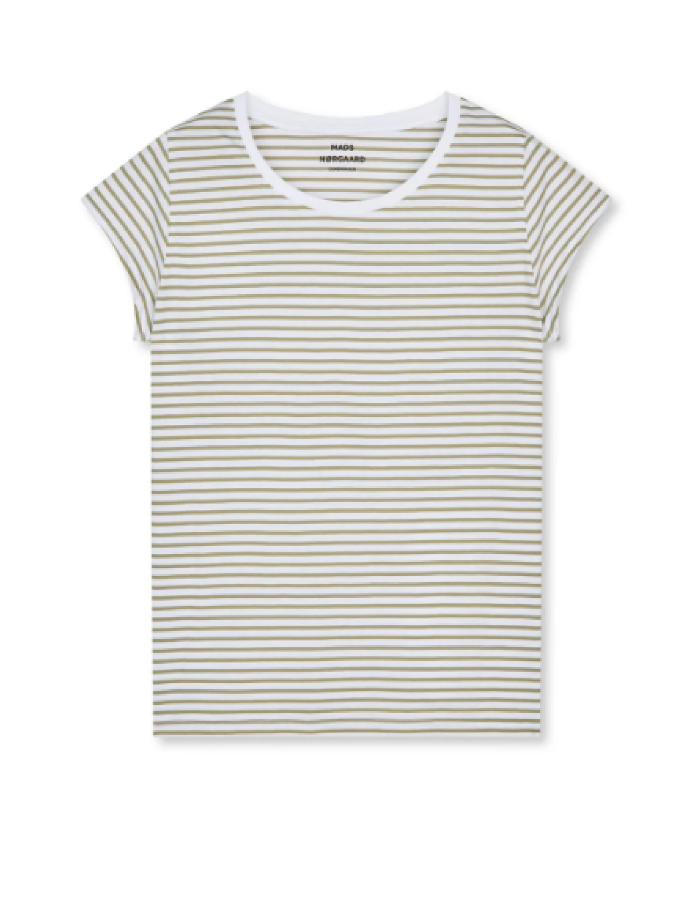 Mads Nørgaard Fine Jersey Stripe Teasy Tee FAV er en stribet t-shirt i en let og blød kvalitet med et enkelt og feminint udtryk. Farvekombinationen giver et roligt look, der er nemt at indpasse i hverdagsgarderoben.Pasformen er tætsiddende og følger kroppen, mens de korte ærmer giver en let og afslappet silhuet. En behagelig t-shirt, der fungerer godt alene og er oplagt som lag under skjorter og strik.