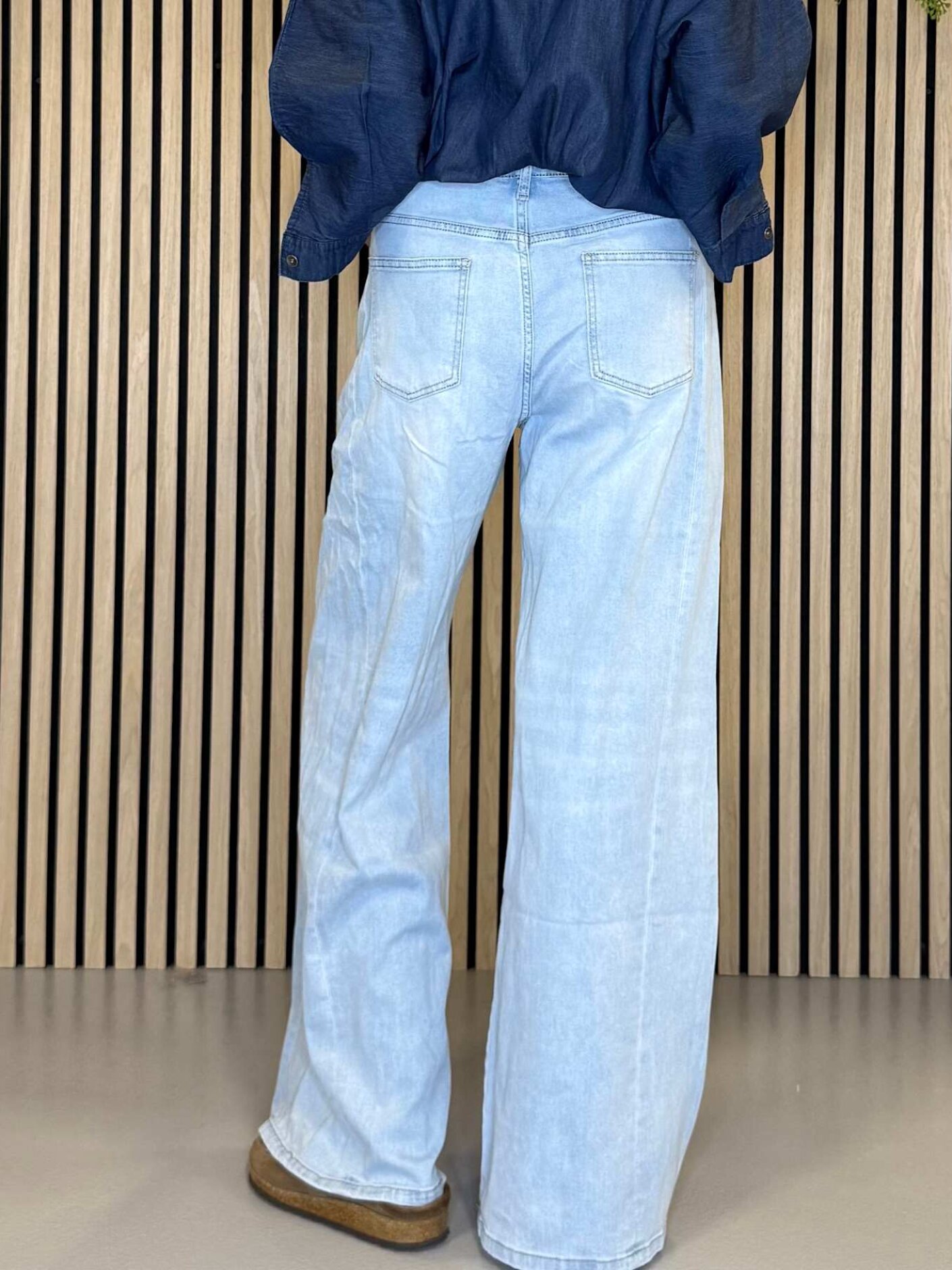 Disse jeans har et roligt, afslappet udtryk med lige, brede ben og en lys denimvask, der passer naturligt ind i garderoben. De sidder pænt i taljen og falder tungt og lige ned, hvilket giver et moderne, ubesværet look.Materialet har en smule stræk, som gør dem behagelige at have på hele dagen. Brug dem med skjorte, strik eller T-shirt, alt efter om udtrykket skal være afslappet eller mere velklædt.