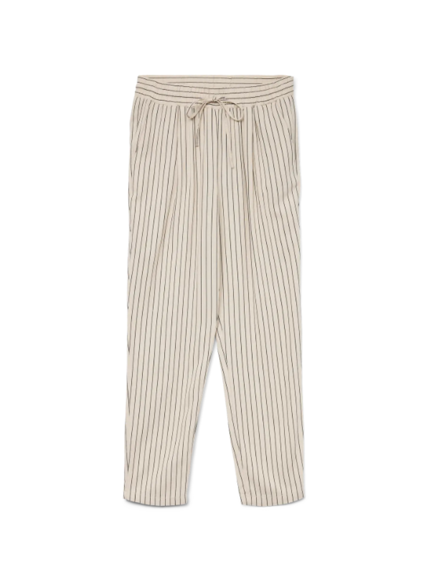 Disse stribede bukser er et let og velafbalanceret valg til hverdagen, hvor komfort og et pænt udtryk går hånd i hånd. Det diskrete mønster giver lidt spil uden at virke dominerende, og gør bukserne nemme at kombinere med både enkle toppe og skjorter.Den elastiske talje med bindebånd sikrer en behagelig pasform, der falder naturligt på kroppen. Den ankellange længde og det rolige snit gør bukserne anvendelige til både hverdag og mere afslappede anledninger, alt efter hvordan de styles.
