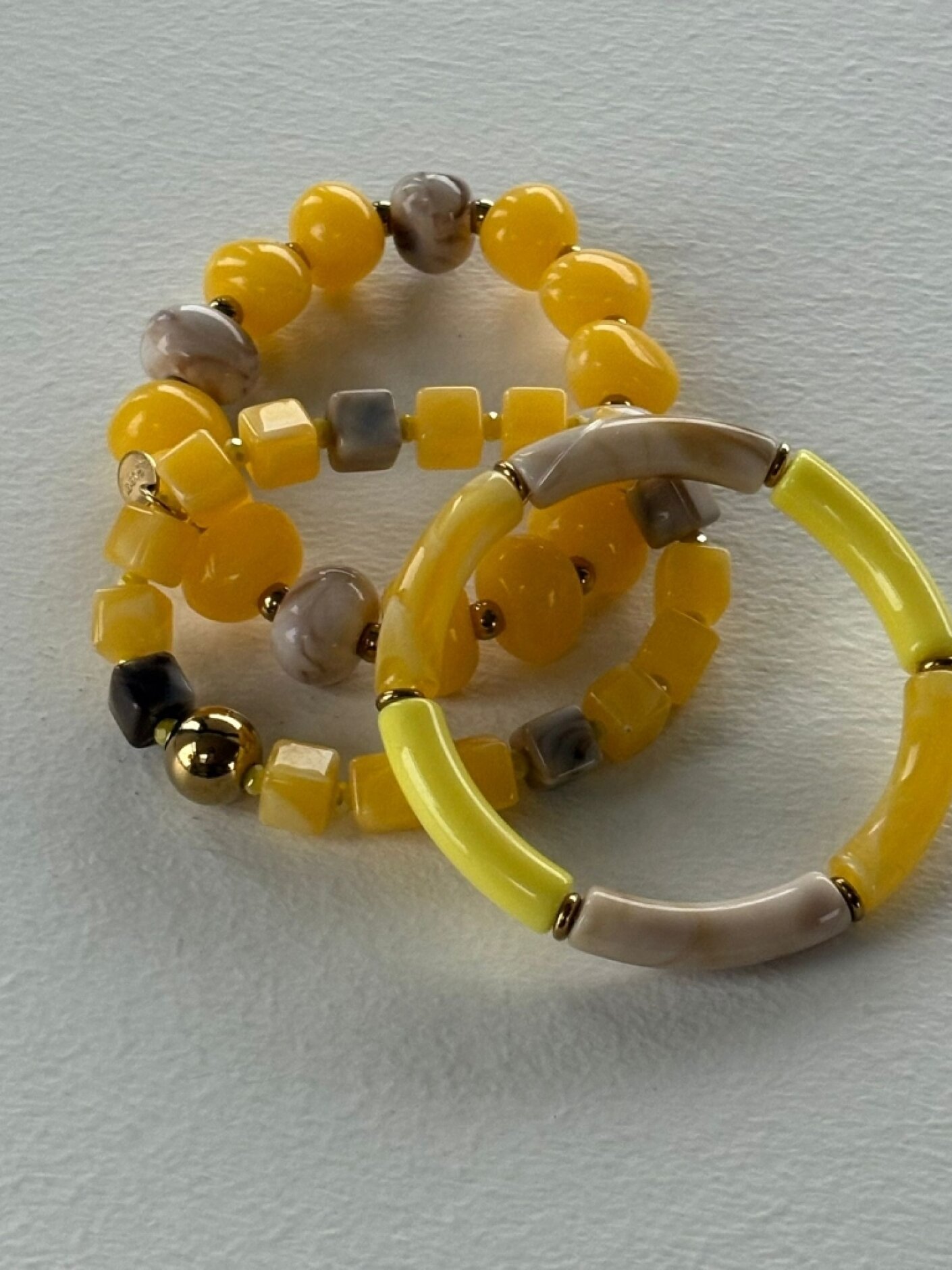 Three M armbånd sæt med 3 stk. er en fin kombination af farver og former, der giver et let og personligt udtryk. De varme gule nuancer er smukt kombineret med bløde beige toner og små guldfarvede detaljer, som tilfører et elegant spil.Armbåndene kan bæres samlet for et markant look eller hver for sig til en mere enkel styling. De elastiske designs gør dem nemme at tage af og på og behagelige at have på hele dagen.