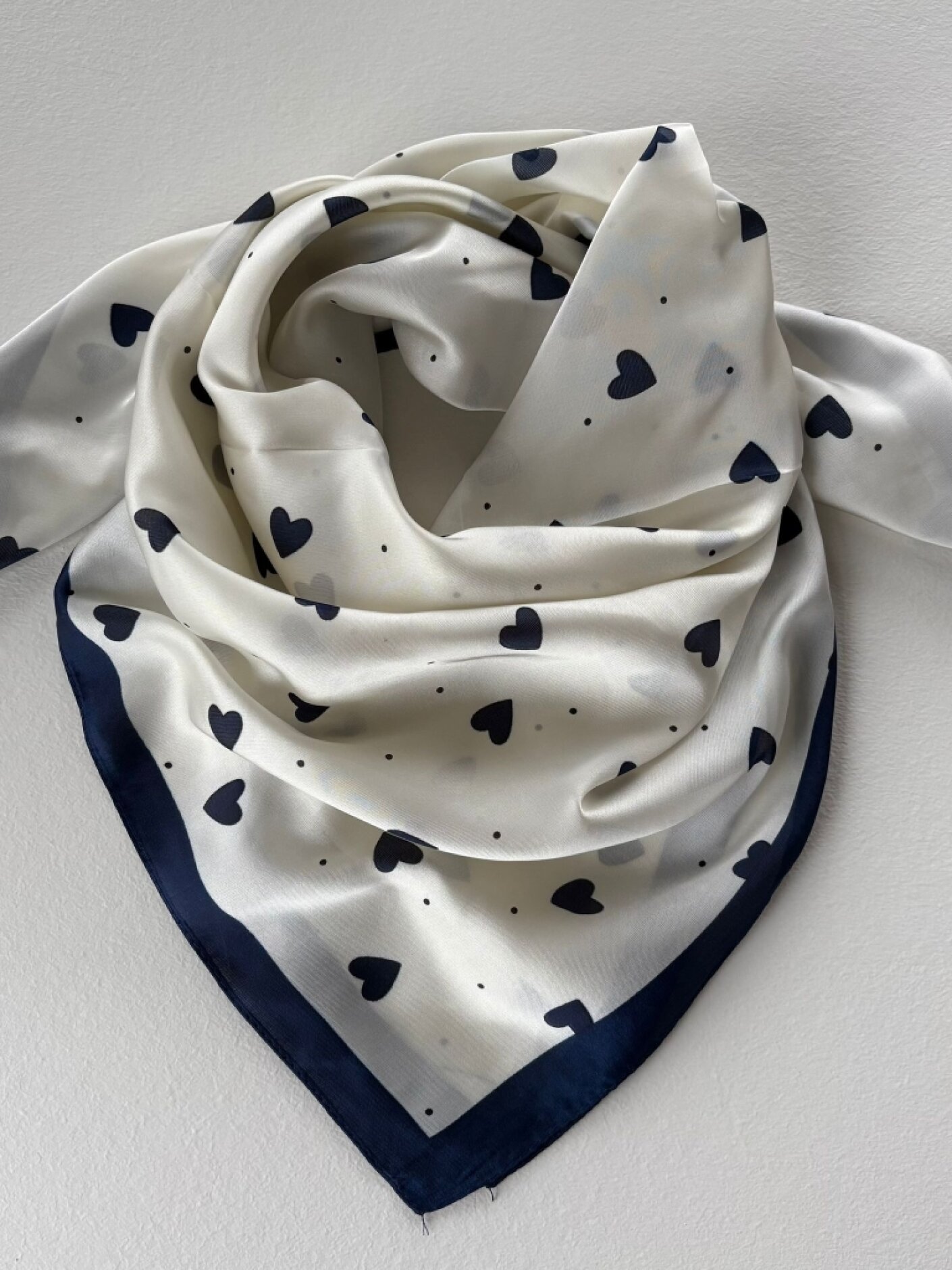 Three M tørklæde i 100% polyester er et let og feminint accessory med et fint hjertemønster. Den navy bund kombineret med kontrastfarvede hjerter og en markeret kant giver et elegant og legende udtryk.Den glatte kvalitet falder blødt og føles behagelig mod huden. Brug det om halsen, i håret eller bundet på tasken for at tilføre et personligt præg og et strejf af farve til både hverdag og pænere brug.