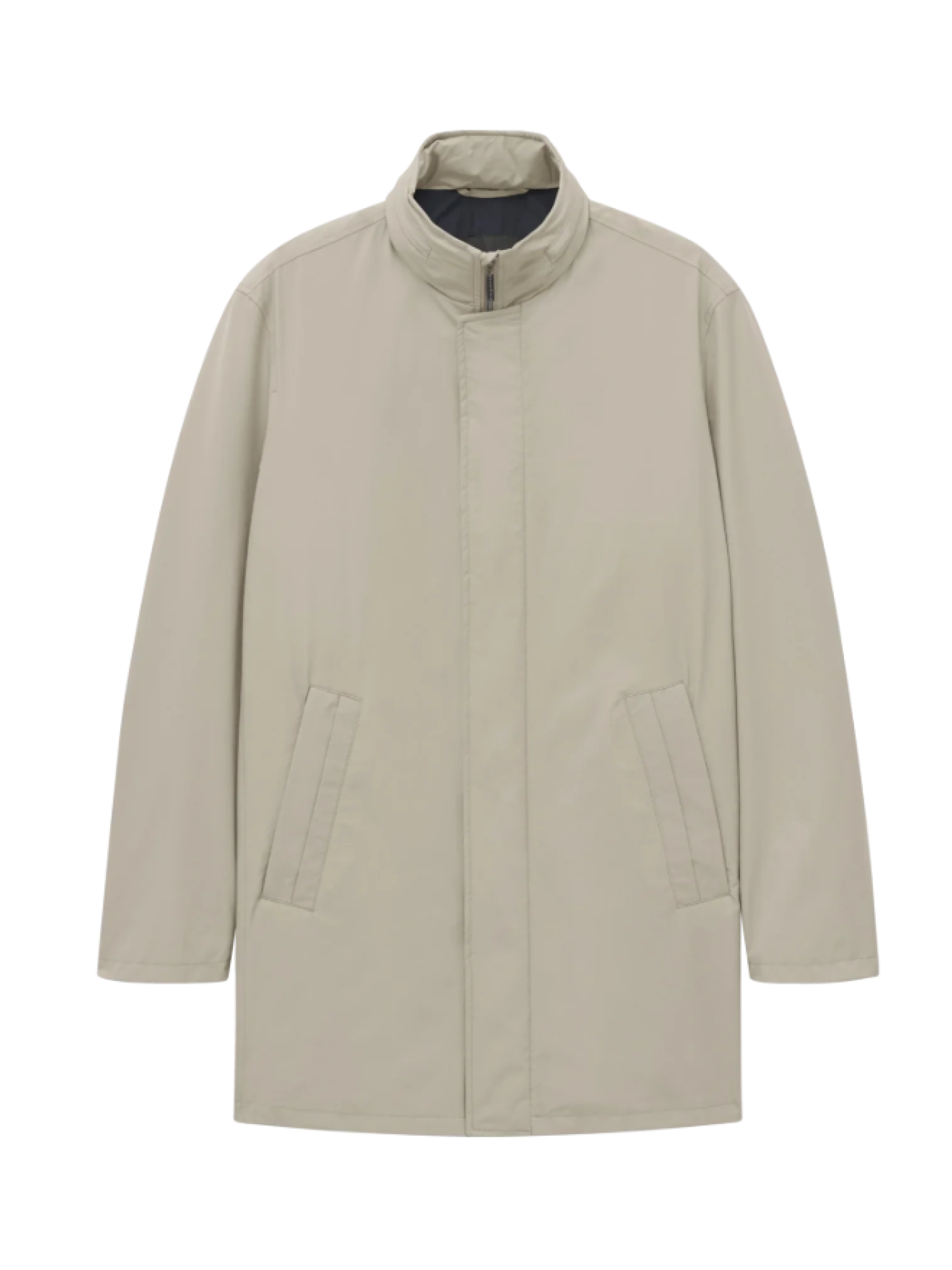 Denne stilrene herrefrakke kombinerer et moderne udtryk med praktiske funktioner, der gør den ideel til både hverdag og mere formelle anledninger. Den elegante Modern Fit pasform giver en flot silhuet, mens det minimalistiske design gør jakken let at kombinere med resten af garderoben.Frakken er designet med en sporty ståkrave, som indeholder en diskret sammenrullelig hætte. Materialet har stretch for øget komfort og bevægelsesfrihed, samtidig med at det er vandafvisende – perfekt til omskifteligt vejr. De praktiske stiklommer med lynlås giver sikker opbevaring af dine ejendele.