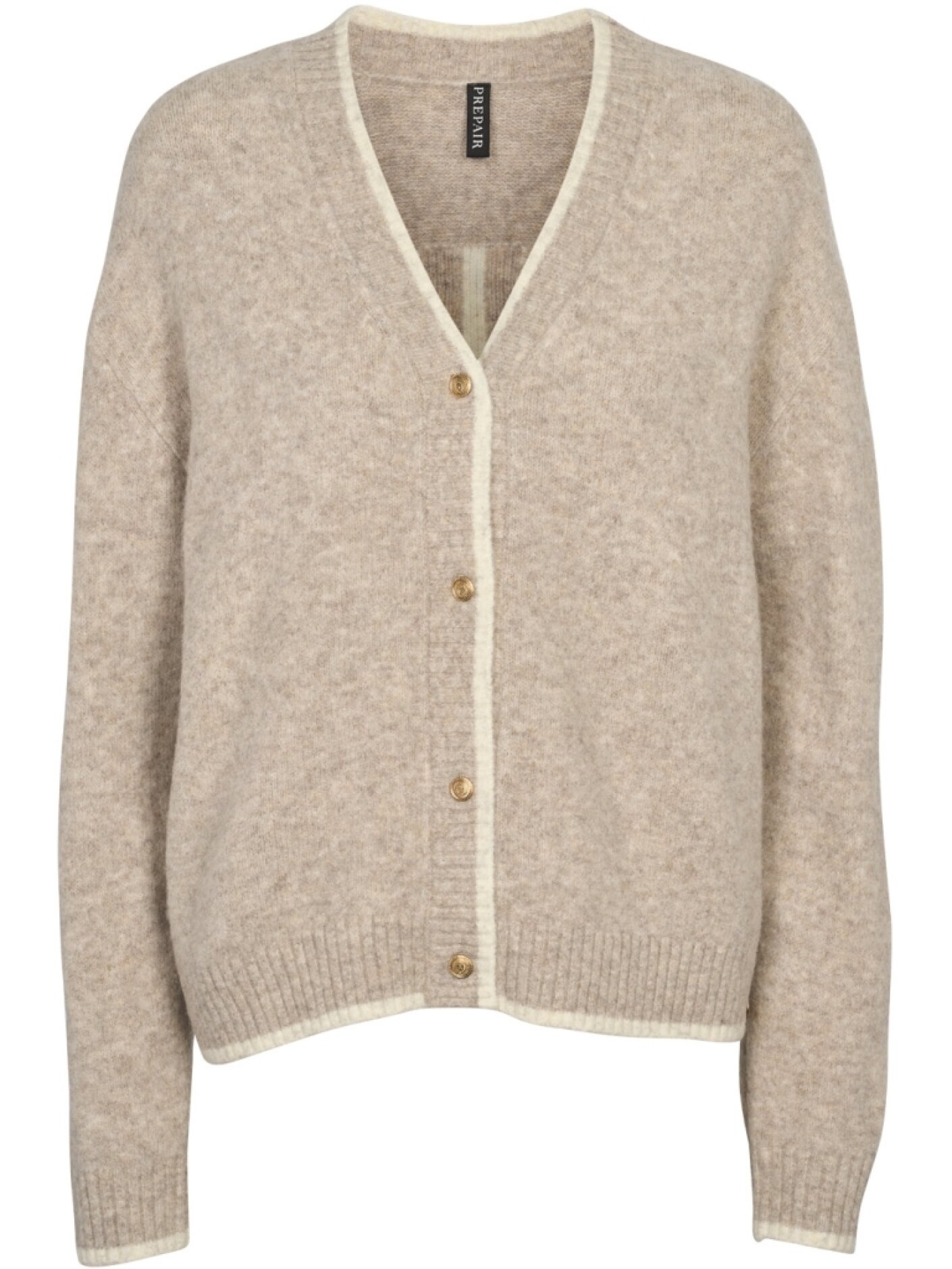 Gigi Knit Cardigan fra PREPAIR er en blød og eksklusiv strik i en smuk sandfarvet nuance. Den klassiske V-udskæring og de gyldne knapper foran giver et tidløst og elegant udtryk, som er nemt at style over både skjorte, kjole eller T-shirt.Pasformen er let løs med fine ribkanter, der sikrer et flot fald. På ryggen finder du et grafisk logo, som tilfører cardiganen et diskret, men karakterfuldt præg. En anvendelig strik til både hverdag og pænere brug.