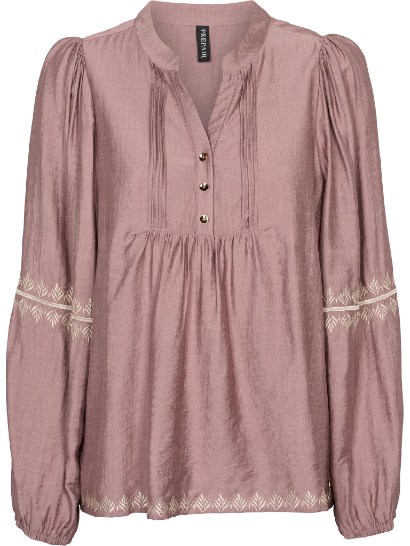Prepair Camilla Blouse er en feminin bluse i en smuk, støvet rosa nuance med et romantisk og let udtryk. Den bløde kvalitet falder flot og giver en behagelig pasform, som gør blusen oplagt til både hverdagsbrug og lidt pænere anledninger.Blusen er designet med en lille ståkrave, V-udskæring og en kort knaplukning foran med fine guldknapper. De lange ærmer har let puff ved skuldrene og elastik ved håndleddene, mens broderede detaljer på ærmerne og langs kanten forneden tilfører et elegant og dekorativt præg.