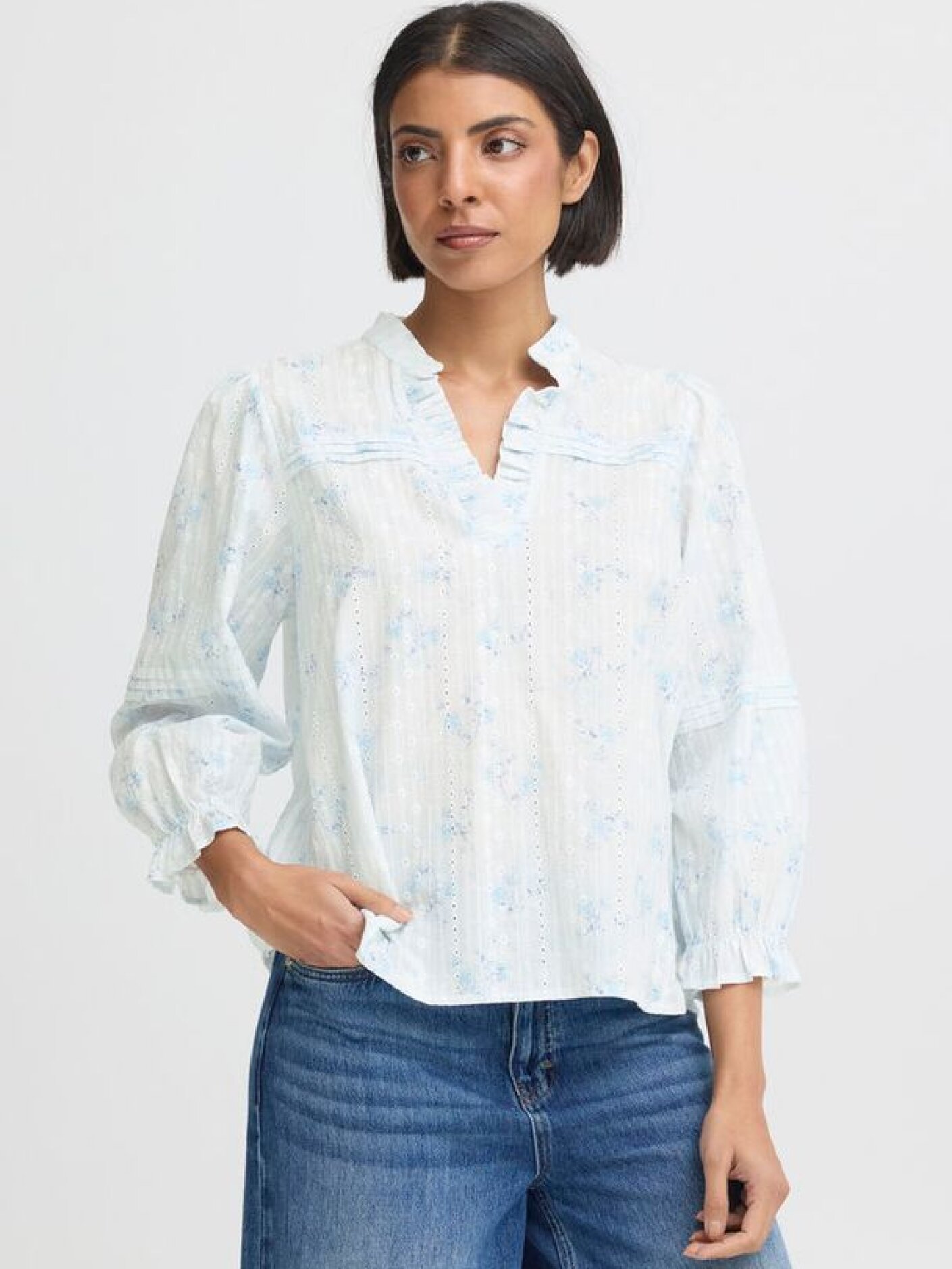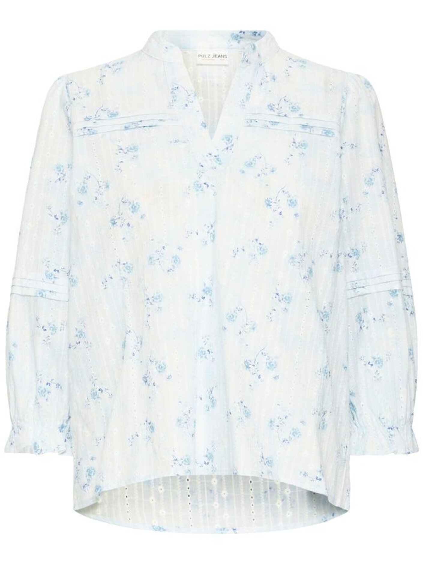 Pulz PZBellarose Blouse er en let og feminin bluse i en blød bomuldskvalitet med et fint blomsterprint i lyse blå nuancer. Den lyse bundfarve og de små blomster giver et friskt og sommerligt udtryk, som gør blusen nem at style til både jeans og lette bukser.Blusen er designet med en lille ståkrave og en diskret V-udskæring, som giver et enkelt og elegant look. De 3/4-lange ærmer har let vidde og elastik ved håndleddene, hvilket skaber et blødt fald og en behagelig pasform til hverdagen.