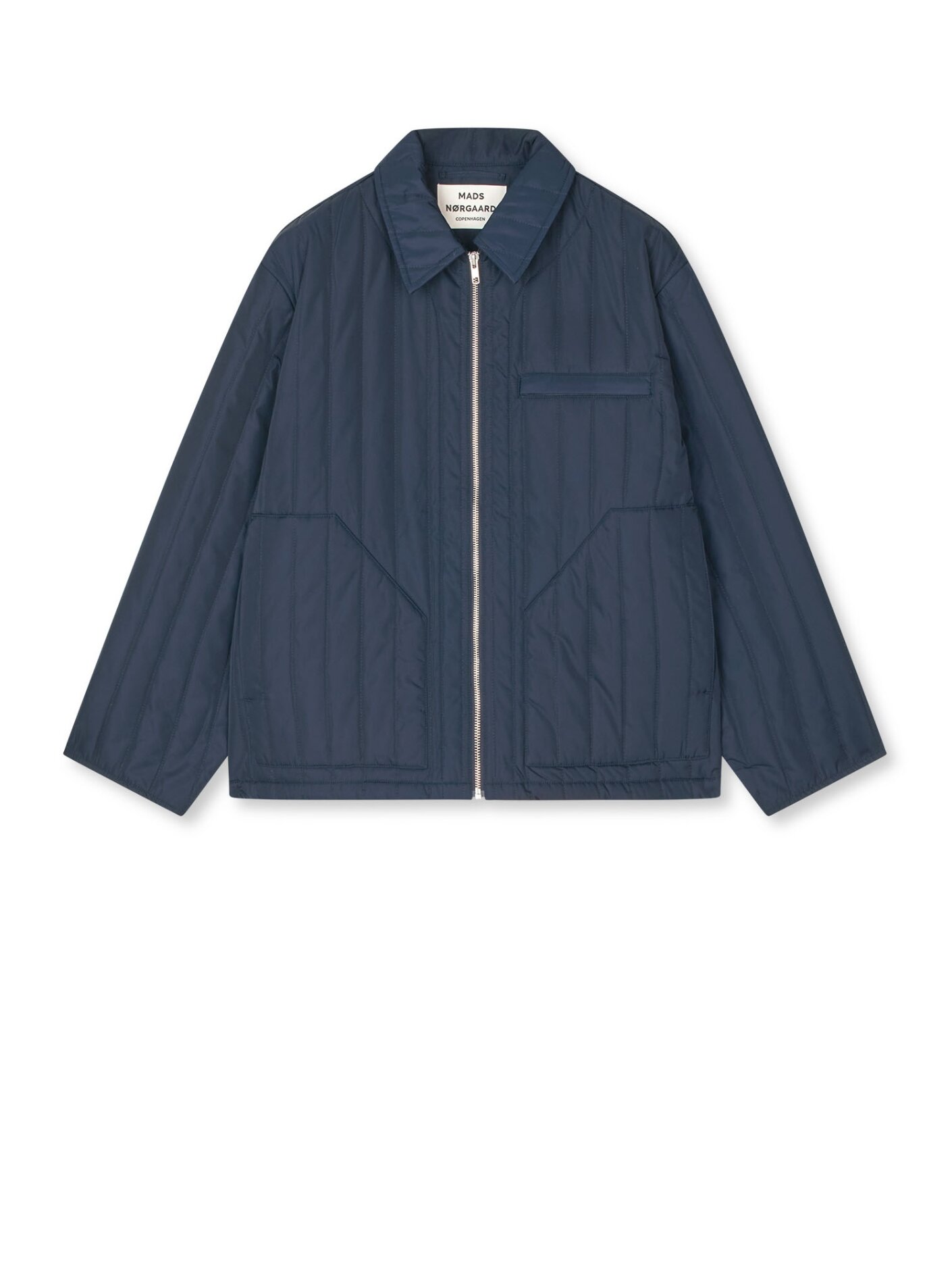 Mads Nørgaard Poly Twill Flora Jacket er en let quiltet jakke i en rolig sky captain nuance. Den enkle udformning kombineret med den diskrete struktur giver et afslappet og tidløst udtryk, der fungerer godt i overgangsperioder.Jakken er designet med klassisk krave, lynlukning samt brystlomme og sidelommer. Den lige, afslappede silhuet gør den behagelig at have på og nem at style både over skjorter, strik eller lette lag.