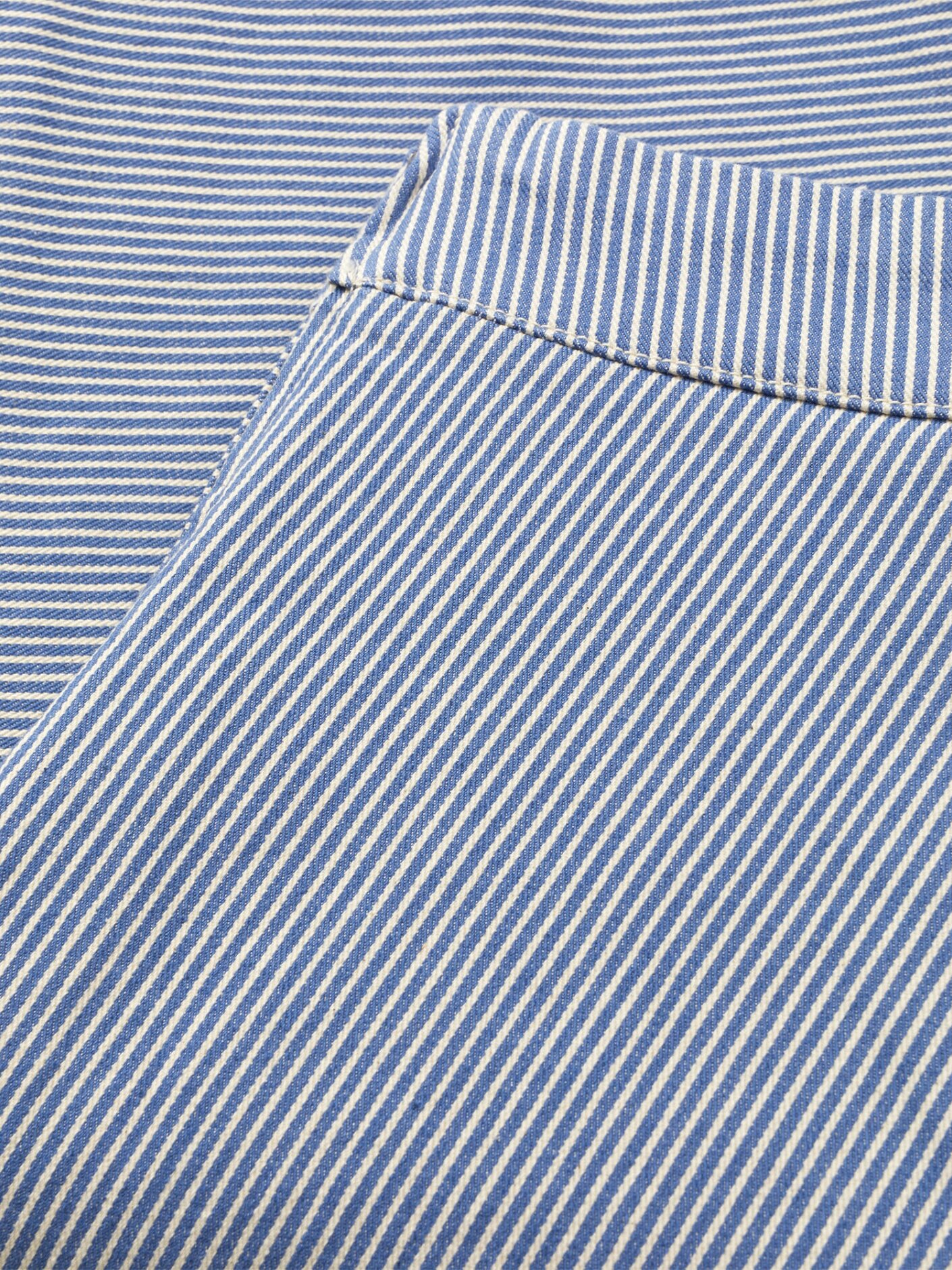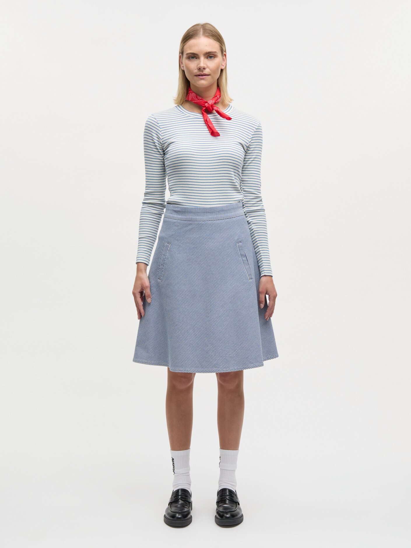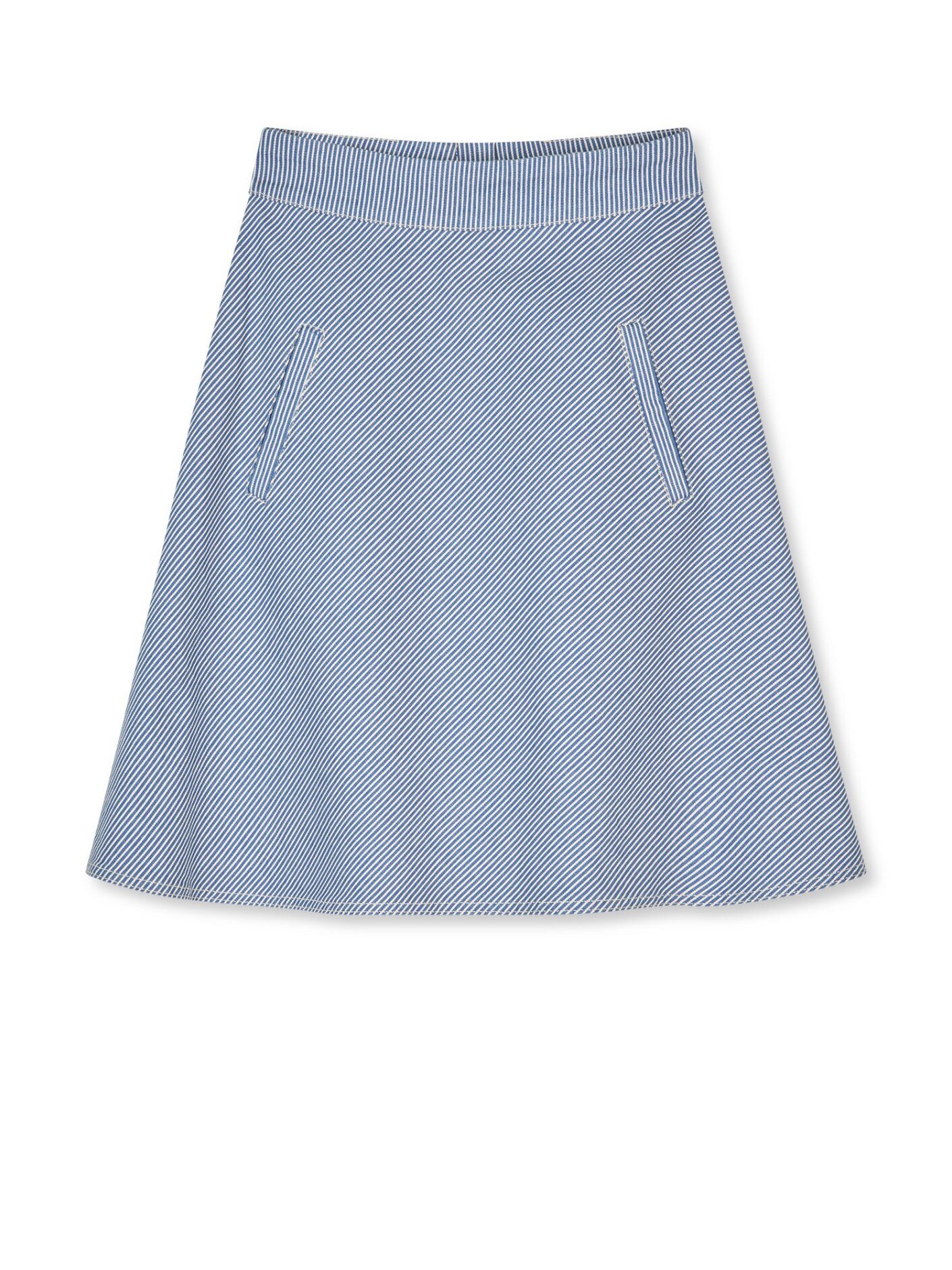 Mads Nørgaard Hickory Punk Stelly Skirt er en A-formet denimnederdel i en klar bright cobalt nuance, der giver et friskt og karakterfuldt udtryk. Den høje talje og den rene linje skaber en feminin silhuet, som er nem at style til både hverdag og mere afslappede anledninger.Nederdelen er designet med lommer og fast linning med lynlås bagpå, hvilket giver et enkelt og velafbalanceret look. Den lette stretch i materialet bidrager til en behagelig pasform, der følger kroppen uden at stramme.