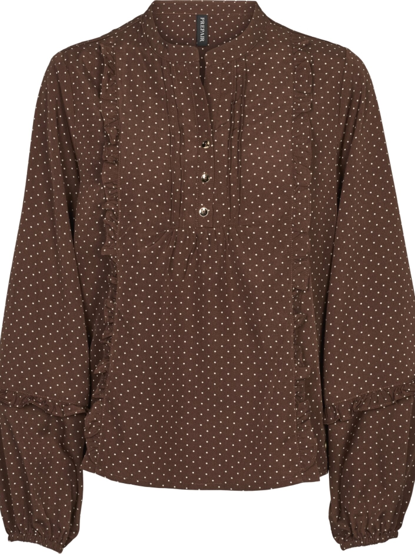 Camilla Blouse er en feminin og let bluse med et elegant prikket mønster i brun. Den har rund hals med en lille V-åbning og knappelukning foran, som giver et blødt og klædeligt udtryk.Fine flæsedetaljer løber lodret langs fronten og videre ud på ærmerne og tilfører en romantisk kant. De lange ærmer har let vidde og afsluttes med elastik ved håndleddene, hvilket giver en behagelig pasform og et diskret puffet look.