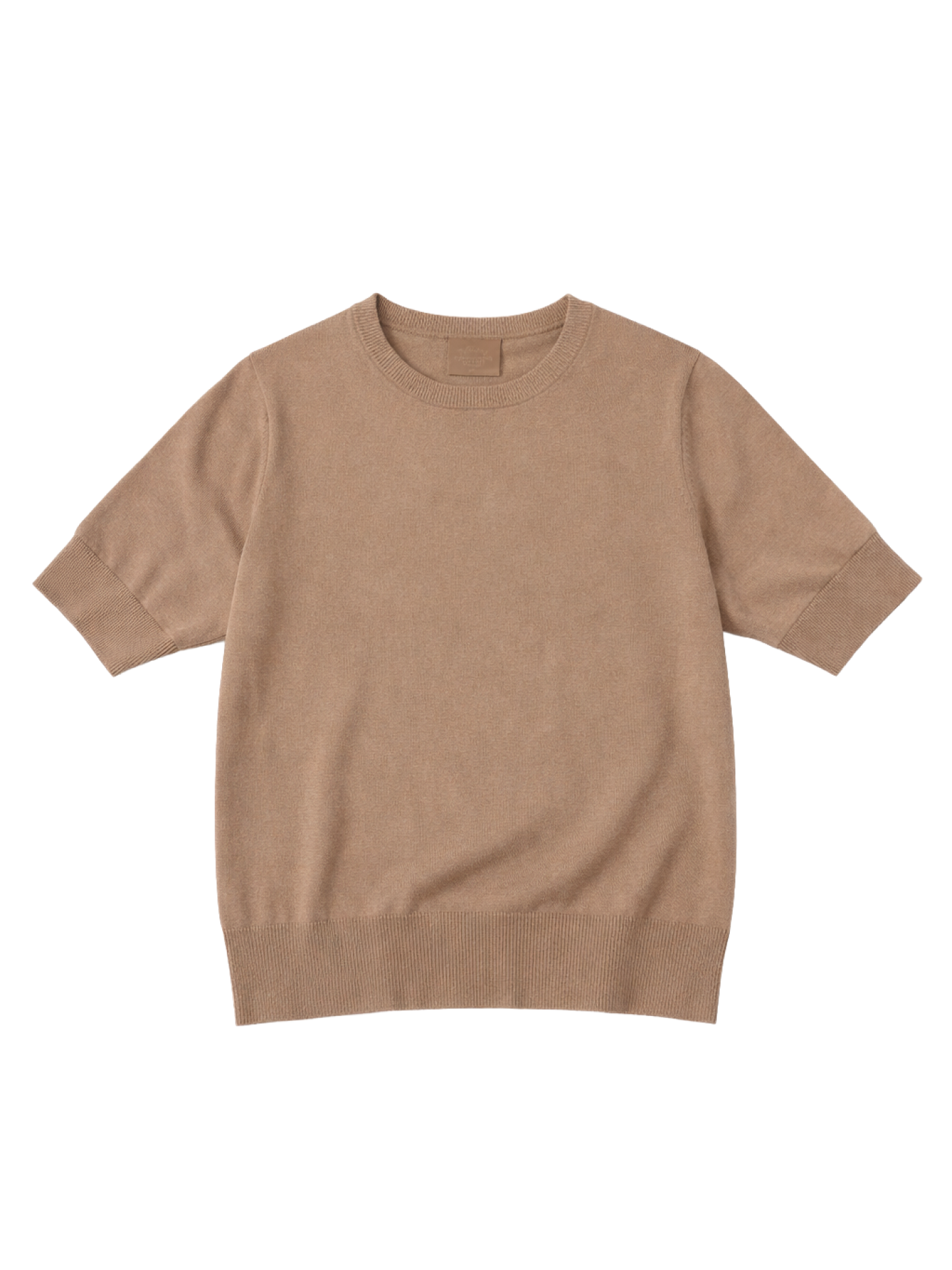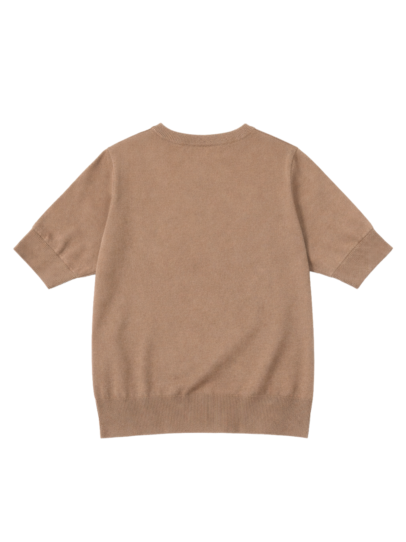 Kopenhaken strik T-shirt i Savannah Tan er en let og elegant style med et roligt, nordisk udtryk. Den fine, glatte strik og korte ærmer giver et enkelt look, der fungerer både til hverdagsbrug og mere afslappede, pæne anledninger.Kvaliteten føles blød og smidig mod huden, og den lette strik gør den behagelig at have på gennem hele dagen. Den varme brune nuance er nem at style med både lyse og mørke farver og giver et tidløst præg til garderoben.