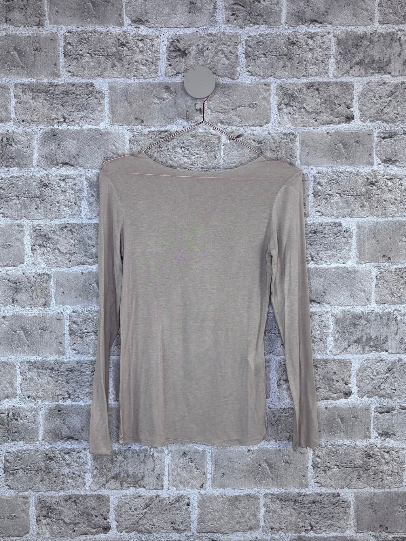 Denne langærmede basis bluse er en enkel og alsidig style med et blødt og let udtryk. Den beige nuance giver et roligt og tidløst look, som er nemt at kombinere med resten af garderoben. Den tætsiddende, elastiske kvalitet smyger sig behageligt til kroppen.Kombinationen af viskose og en smule cashmere giver en ekstra blød fornemmelse mod huden. Den lette stretch sikrer god bevægelighed, og den enkle silhuet gør blusen oplagt både som inderlag og som en let, selvstændig style til hverdagen.