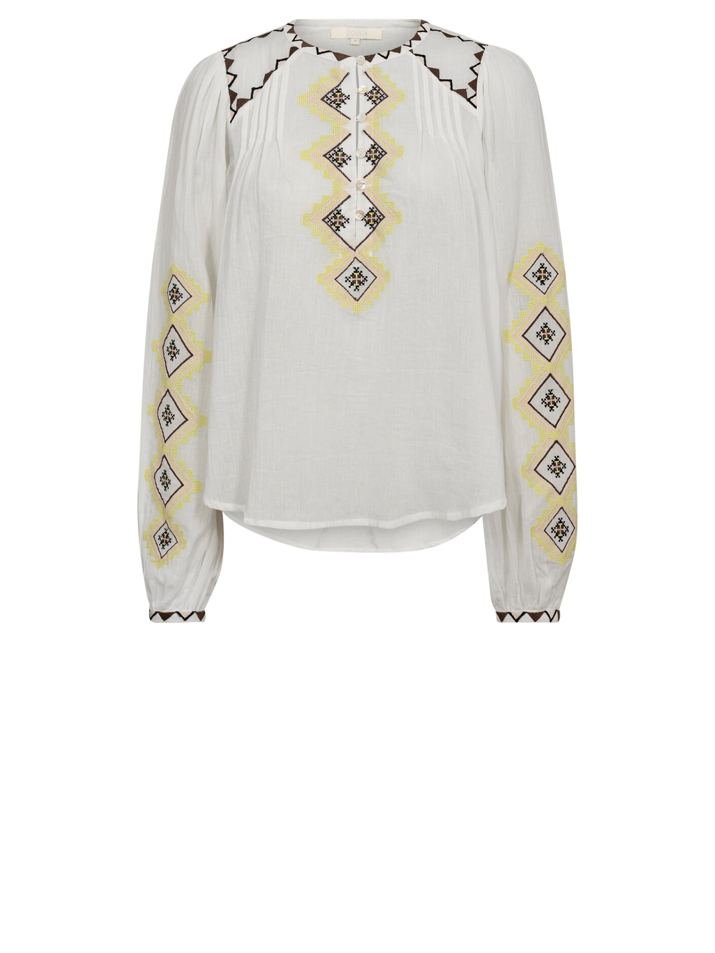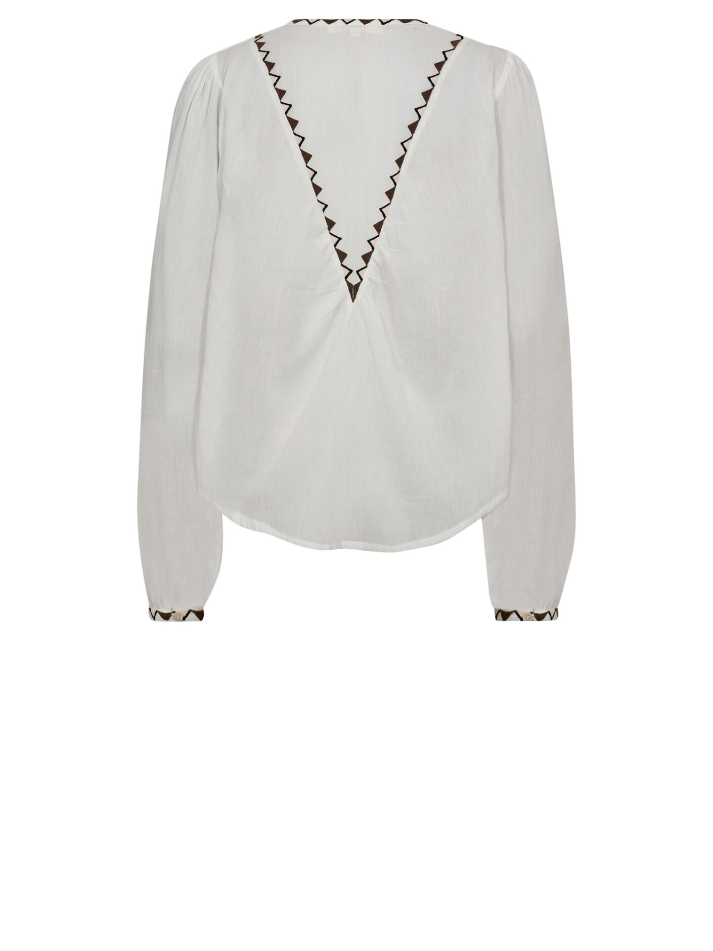 Gossia bluse i en let off-white nuance med dekorative zigzag-broderier i gule og brune toner. Det fine mønster tilfører et håndlavet udtryk og giver blusen karakter, samtidig med at den fremstår lys og sommerlig.Den løse silhuet og lange ærmer gør modellen behagelig at have på, mens den runde halsudskæring holder udtrykket enkelt og anvendeligt. En fin bluse til både hverdag og feriestemning, hvor komfort og detaljer går hånd i hånd.