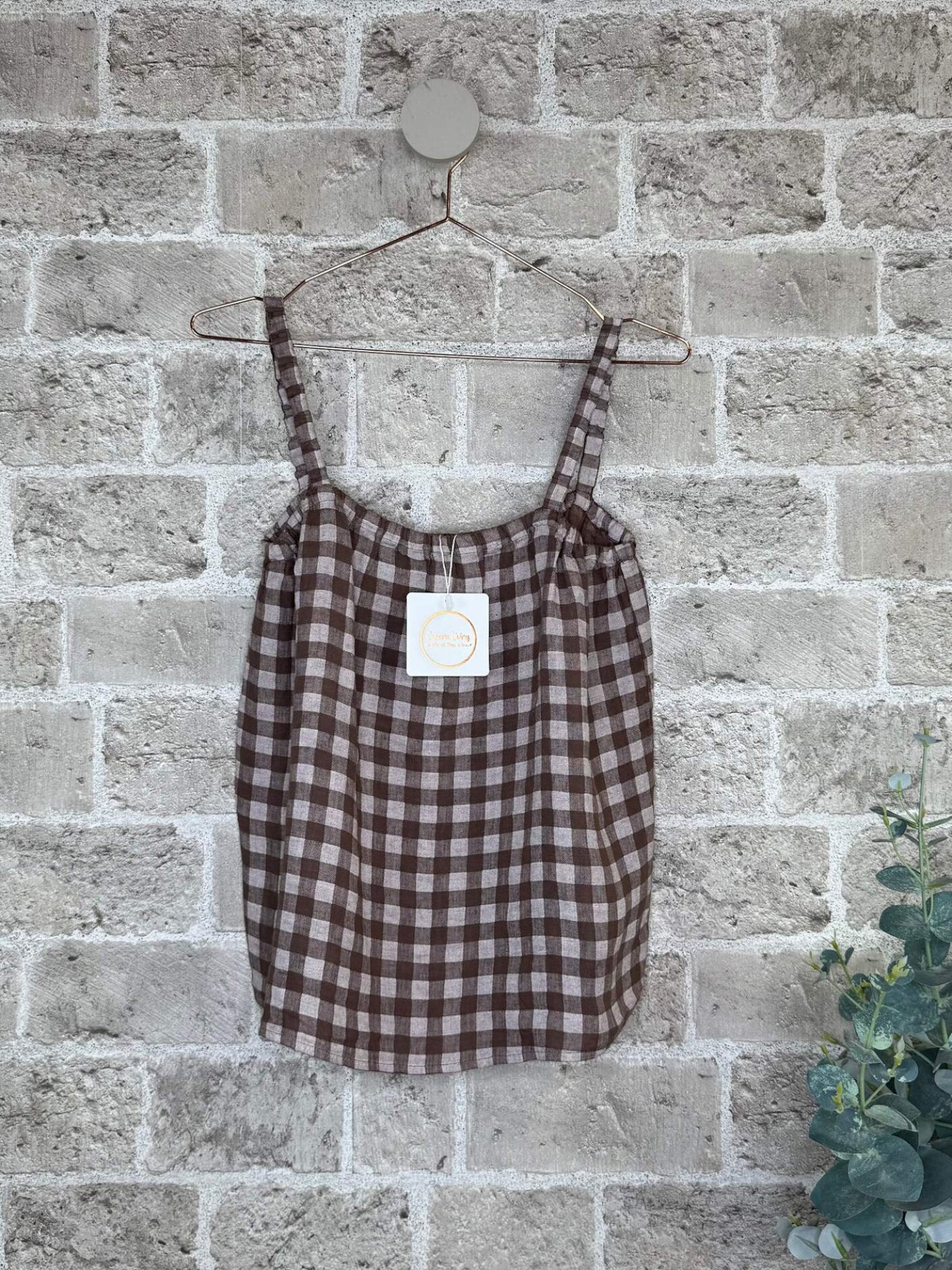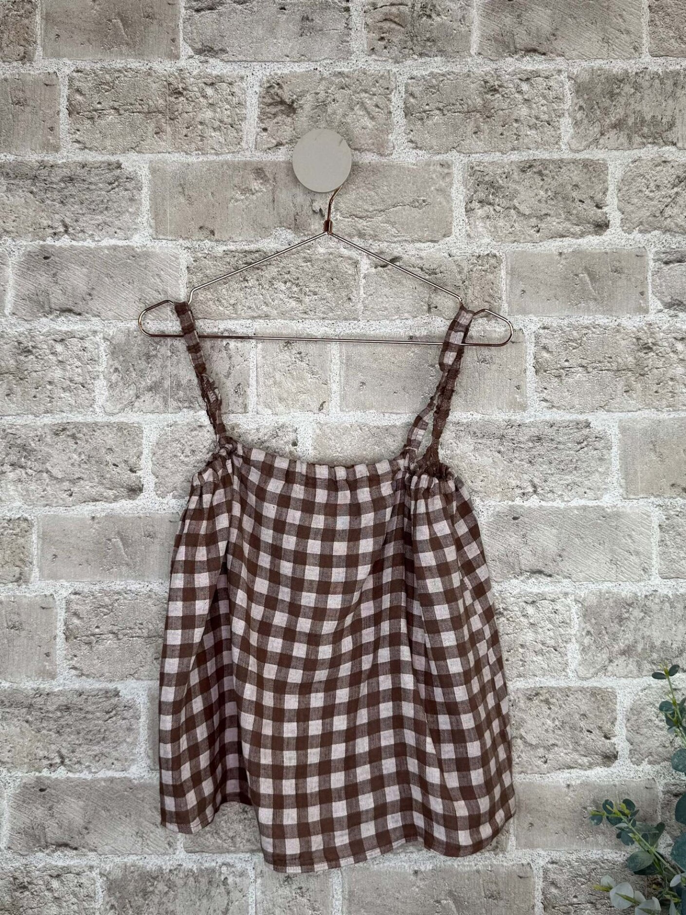 Coster Copenhagen top i en brun og lys ternet kvalitet giver et let og sommerligt udtryk. Den luftige hør føles behagelig mod huden og gør toppen ideel til varme dage, hvor enkelhed og komfort er i fokus.Toppen har en løs pasform med tynde stropper og en let rynket overdel, som giver et blødt fald. Den enkle silhuet gør den nem at style alene eller under en skjorte eller jakke, alt efter anledning.