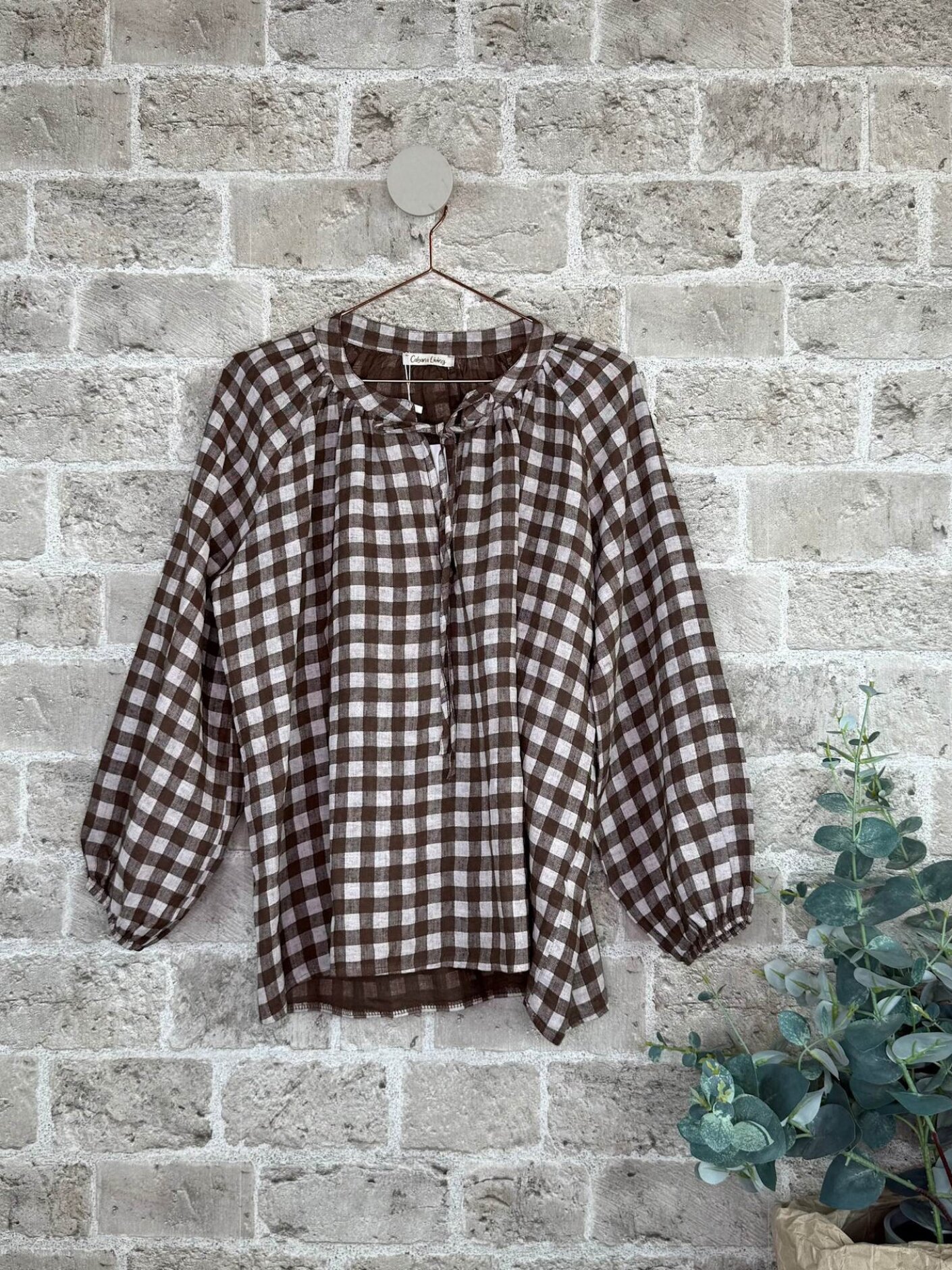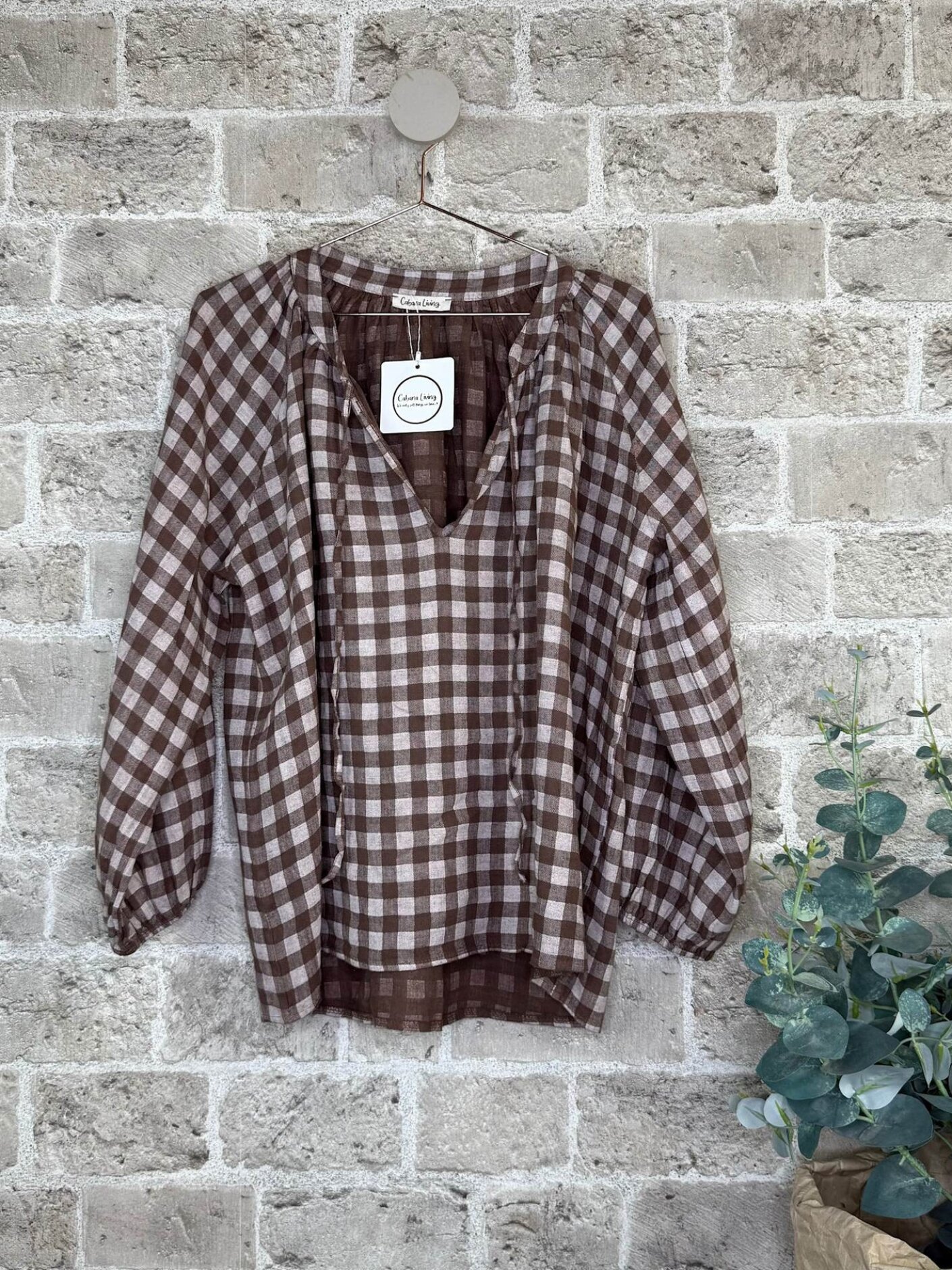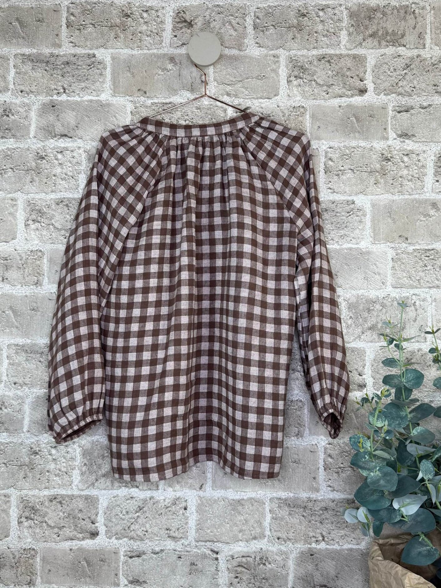 Coster Copenhagen bluse i en brun og lys ternet kvalitet giver et roligt og naturligt udtryk. Den lette hør føles behagelig mod huden og falder blødt, hvilket gør den oplagt til både hverdag og afslappede dage, hvor komfort er i fokus.Blusen har en løs pasform med fine detaljer som bindebånd ved halsen og let rynk ved skuldrene, der giver et feminint udtryk. Ærmerne afsluttes med elastik, hvilket skaber en blød silhuet. En alsidig model, der er nem at style med både jeans og lette bukser.
