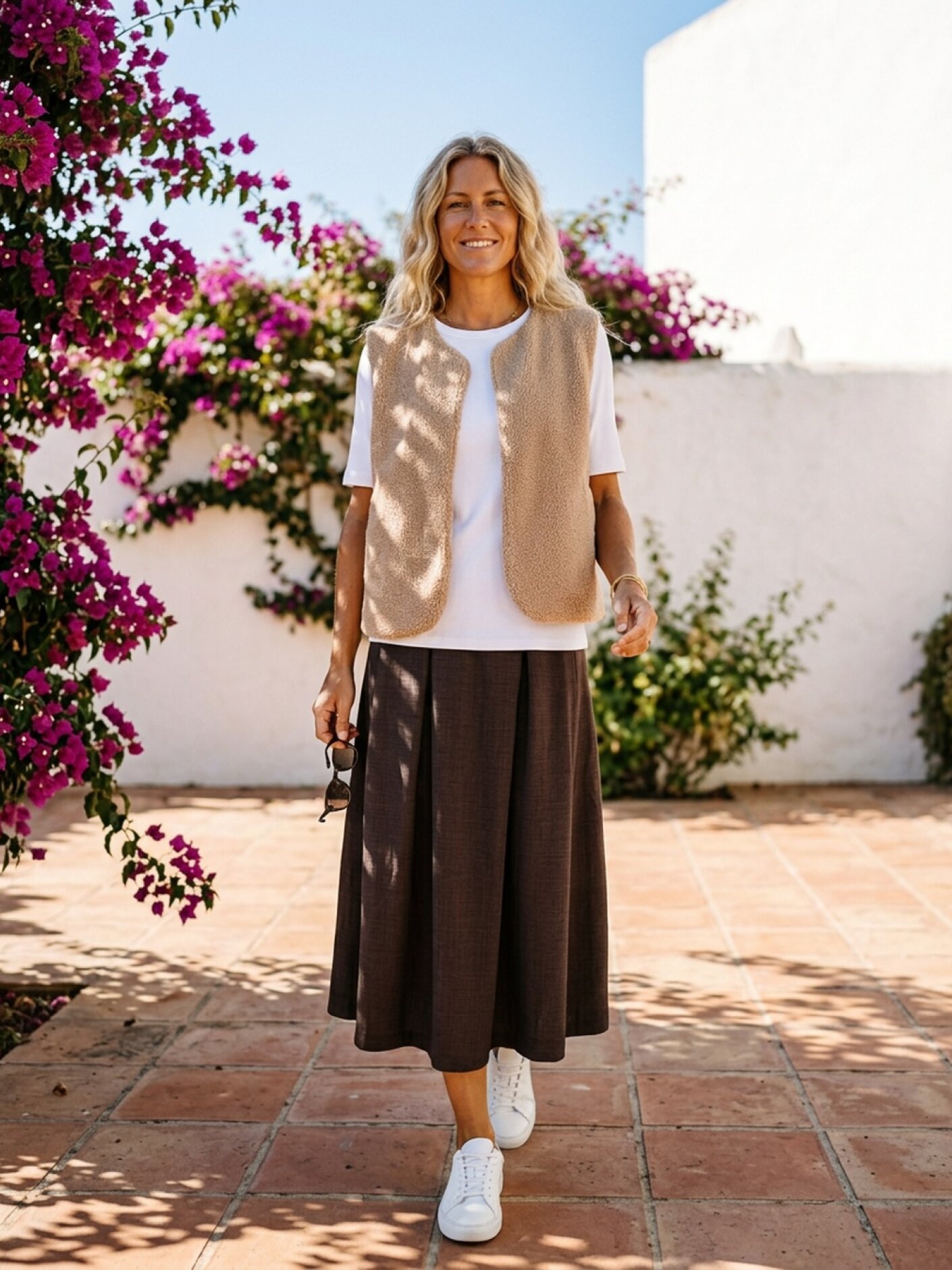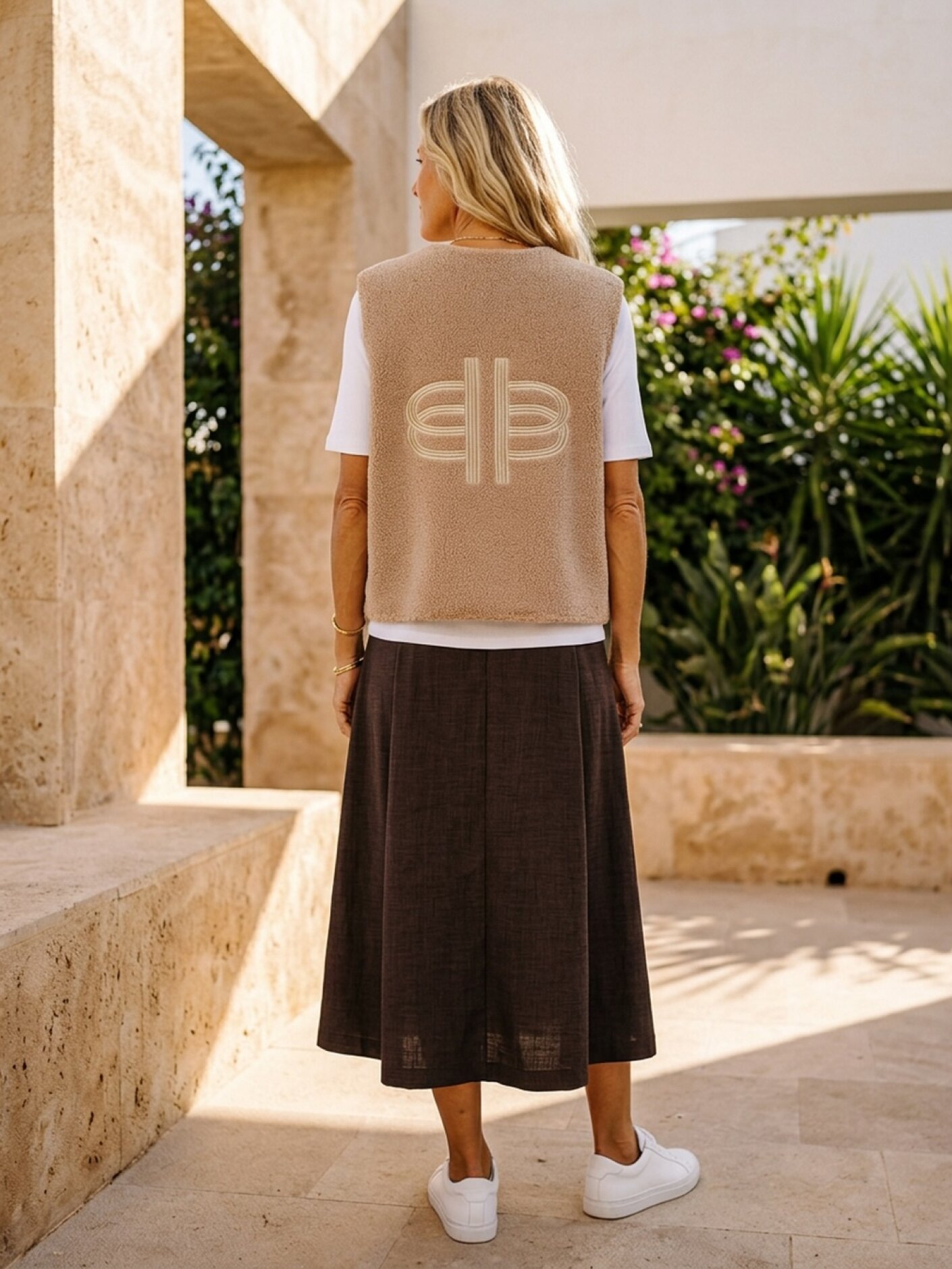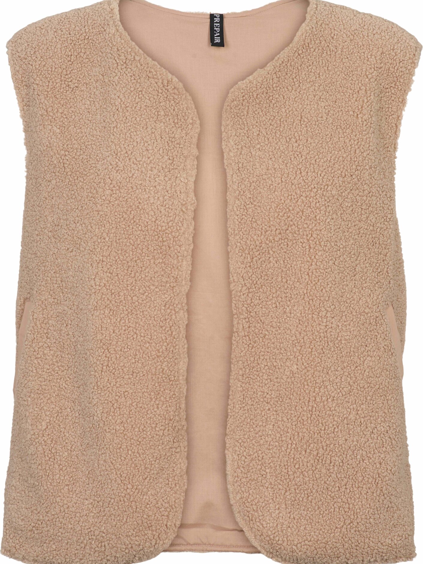 Prepair Tracy Vest i en lys sandfarvet nuance, der giver et blødt og roligt udtryk. Den lette teddy-kvalitet tilfører struktur og varme uden at føles tung, hvilket gør den oplagt som et ekstra lag i overgangsperioder.Den åbne front og afslappede pasform gør den nem at style over både skjorter, strik eller kjoler. Indersiden er glat, så den falder pænt og føles behagelig mod kroppen. En alsidig vest til både hverdag og afslappede anledninger.