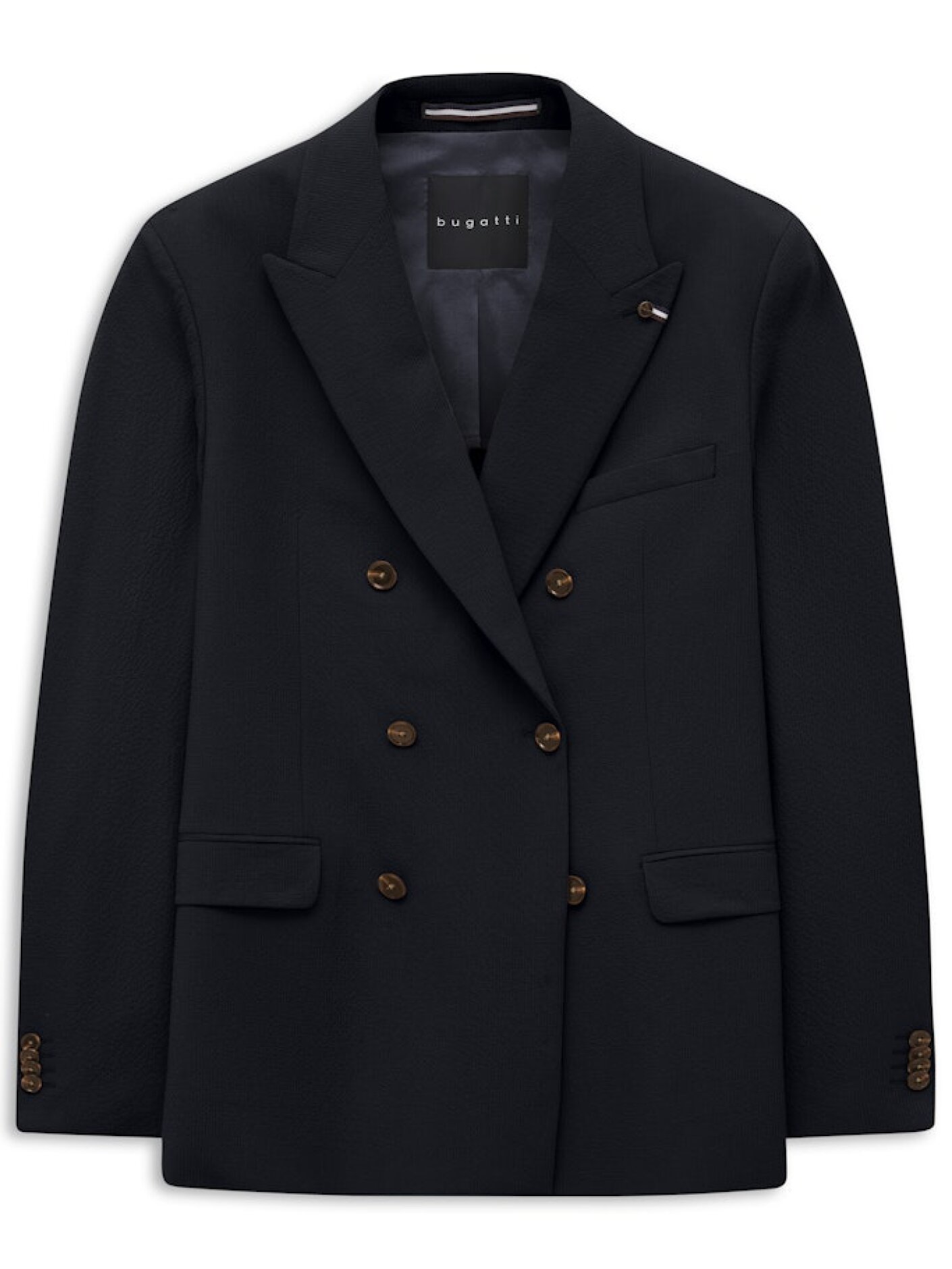 Bugatti blazer i en dyb blå nuance, der giver et klassisk og velklædt udtryk. Den dobbeltradede lukning og de markante knapper tilfører et stilrent, næsten maritimt præg, som gør modellen velegnet til både formelle og mere afslappede sammenhænge.Kvaliteten har en let struktur og føles behagelig at have på, samtidig med at den holder faconen pænt. Brug den over en skjorte eller polo for et gennemført look, der fungerer både til arbejde og pænere hverdagsbrug i sæsonen.