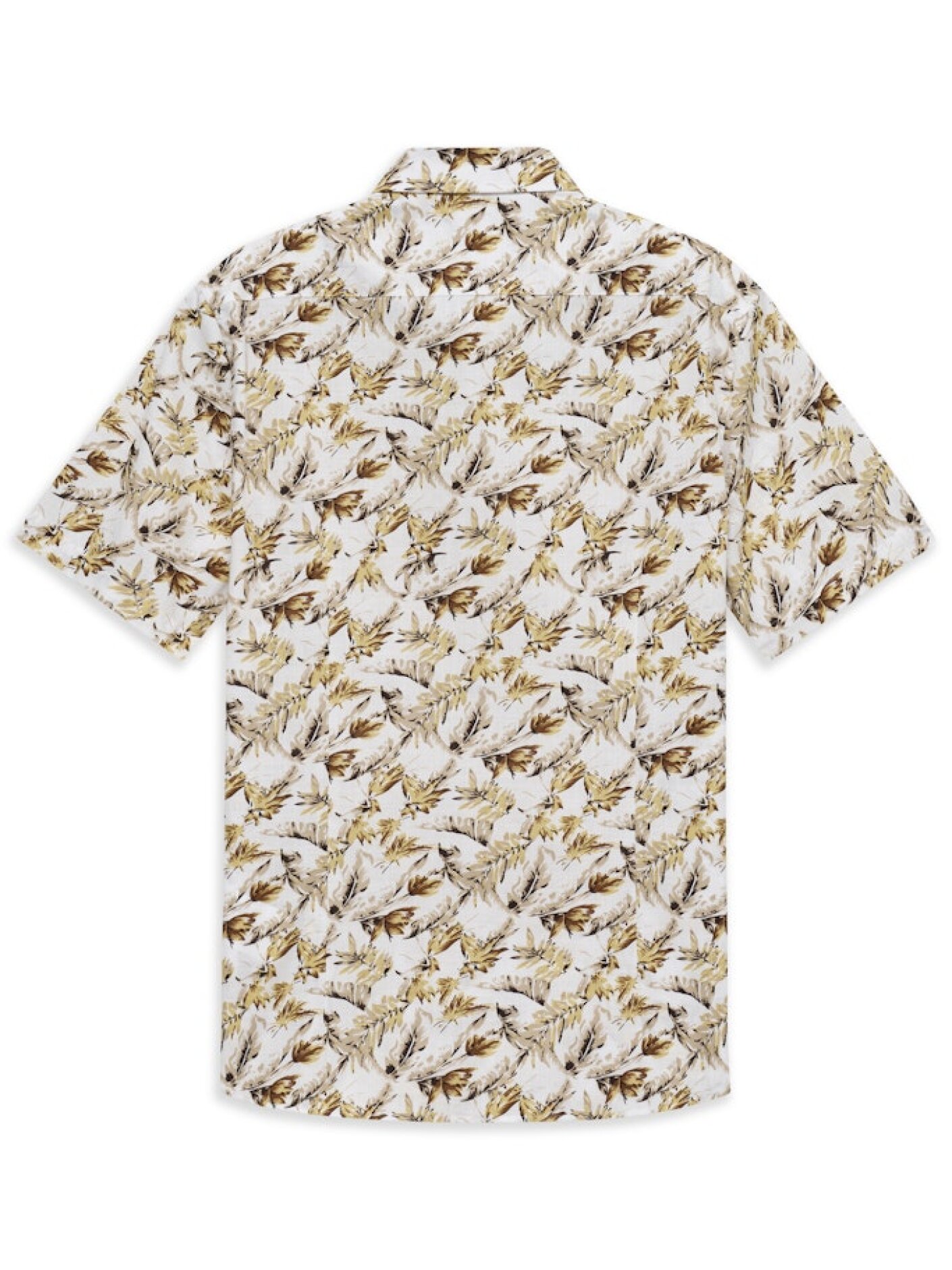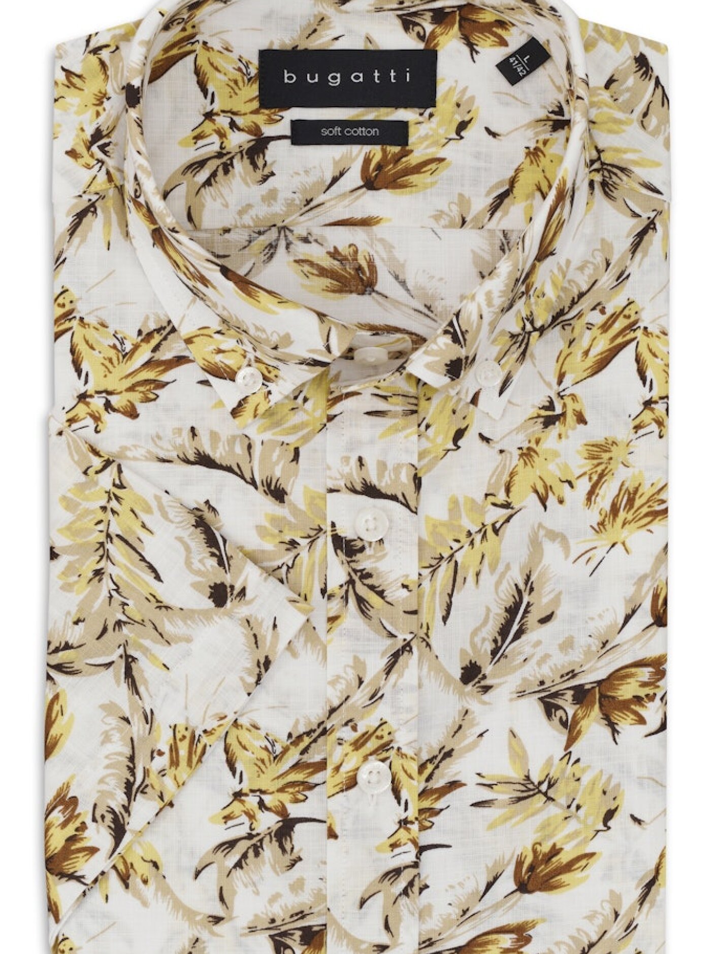 Bugatti skjorte med et let og sommerligt udtryk i en lys bund med gule nuancer og et levende print. Mønstret giver skjorten karakter uden at virke dominerende og gør den oplagt til varme dage, hvor garderoben gerne må have lidt mere spil.Den bløde bomuldskvalitet føles behagelig mod huden og sikrer god komfort hele dagen. Modellen fungerer godt både åben over en T-shirt eller knappet til et mere velklædt look, alt efter anledning.